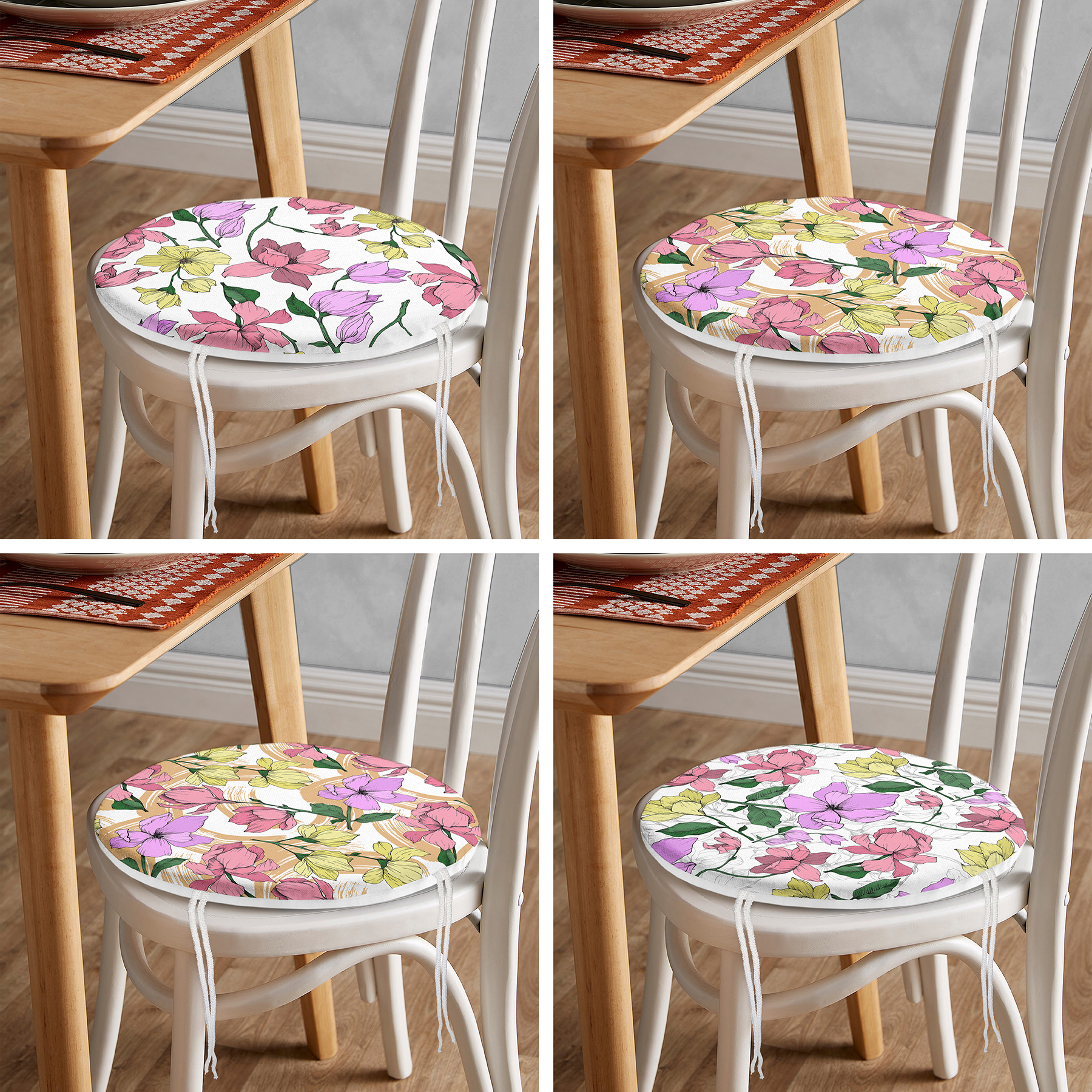 4'lü Beyaz Zemin Üzerinde Renkli Çiçek Desenli Modern Yuvarlak Fermuarlı Sandalye Minderi Seti Realhomes
