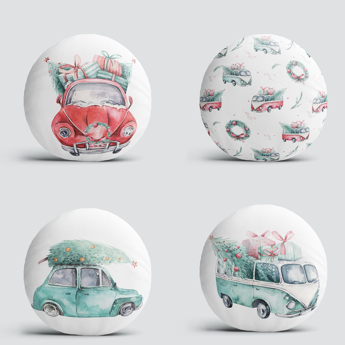 4’lü Çam Ağaçlı Araba Desenli Dijital Baskılı Modern Yuvarlak Yastık Kırlent Kılıf Seti