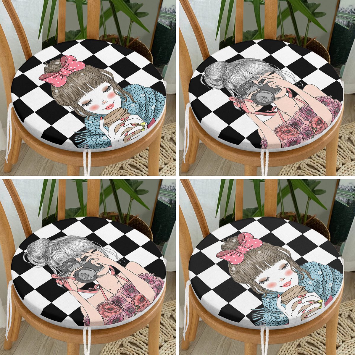 4’lü Damalı Zeminde Pop-Art Kız Tasarımlı Yuvarlak Fermuarlı Sandalye Minderi Seti