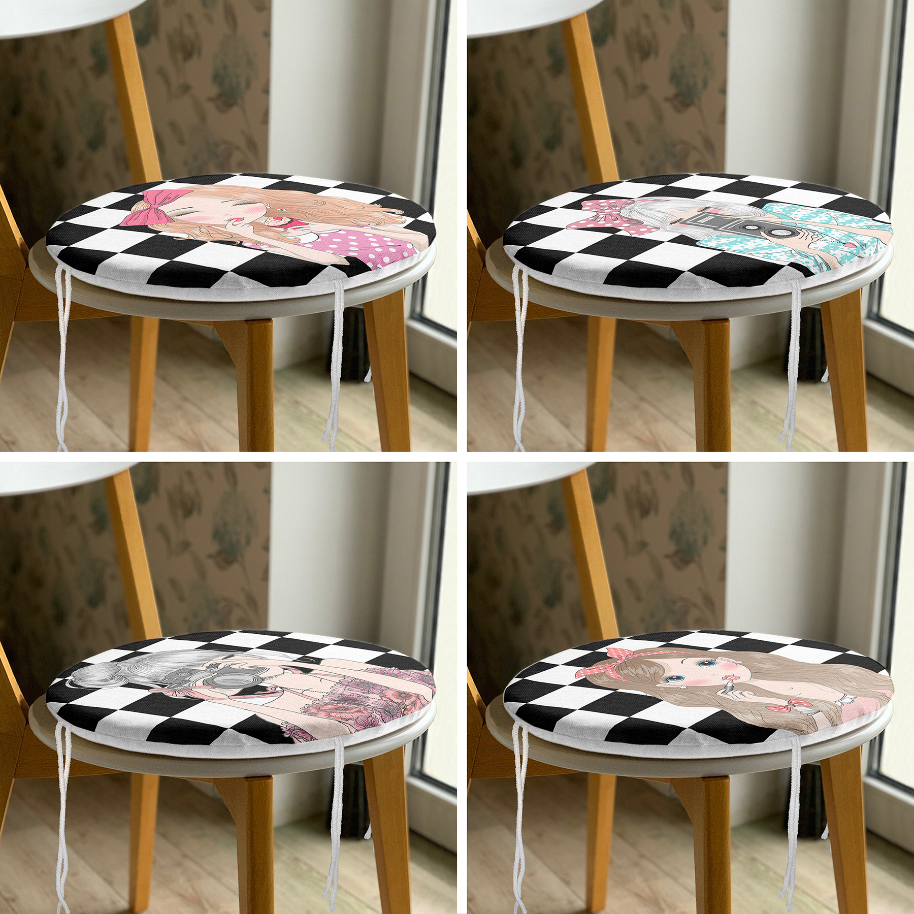 4’lü Damalı Zeminde Pop-Art Kız Tasarımlı Yuvarlak Fermuarlı Sandalye Minderi Seti