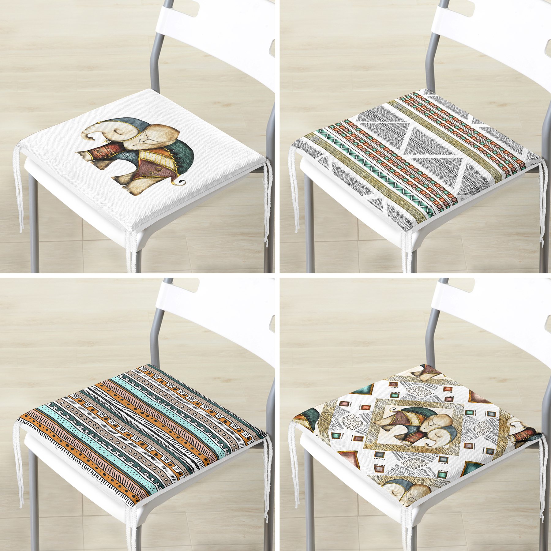 4’lü Etnik Fil Figürlü Dijital Baskılı Fermuarlı Sandalye Minderi Seti