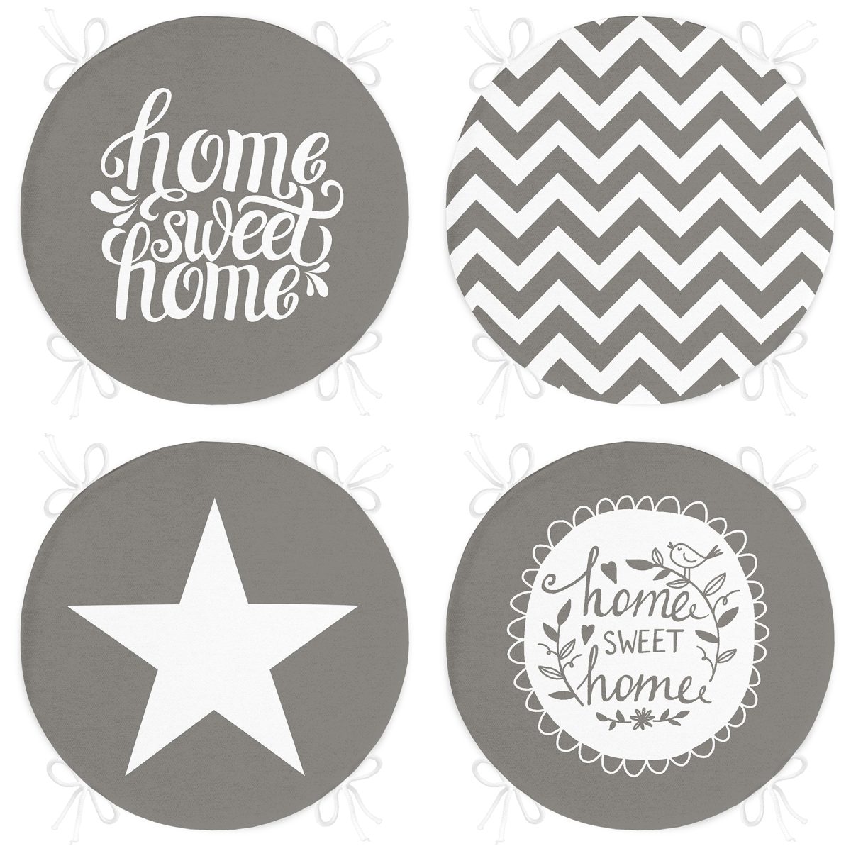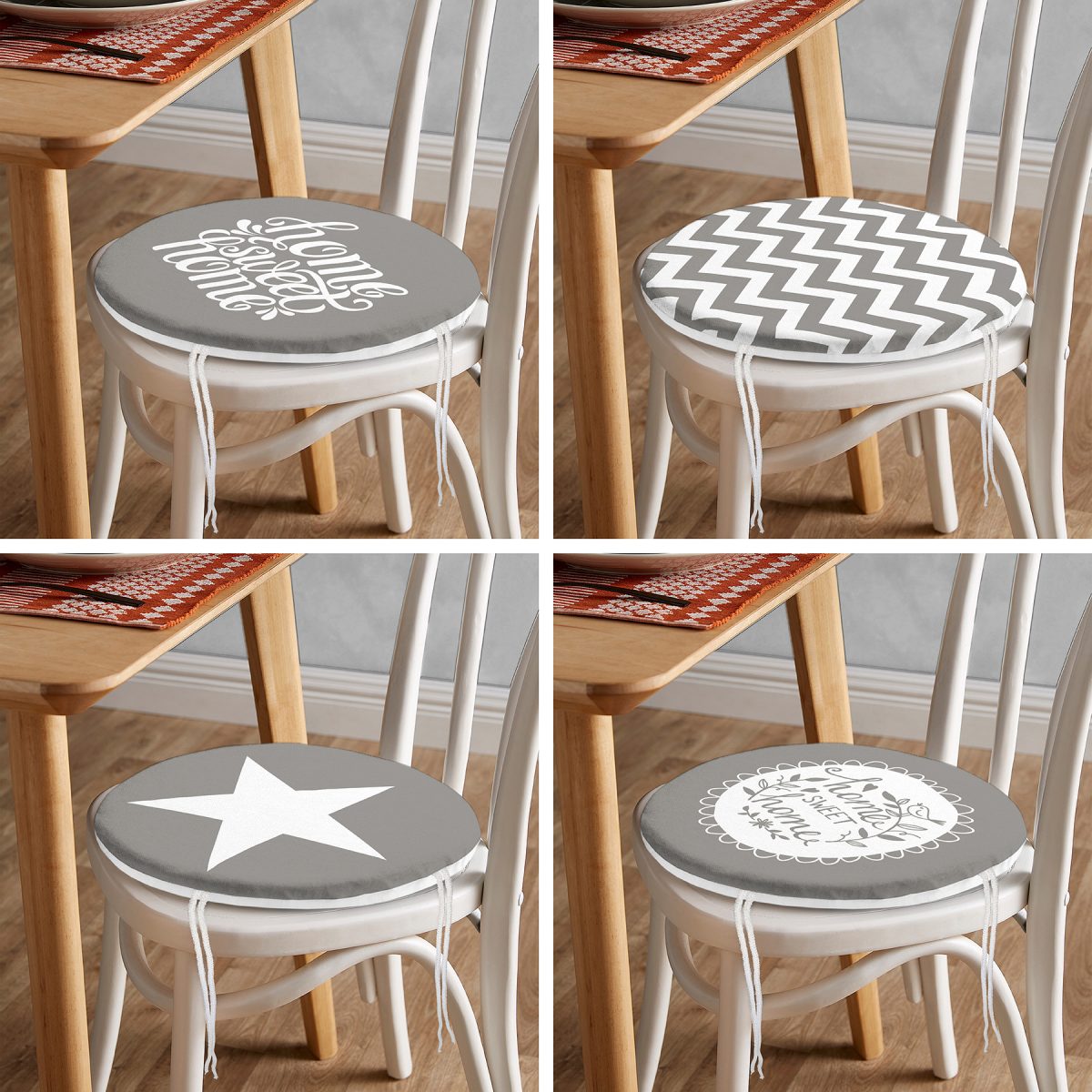 4’lü Gri Motifli Home Sweet Temalı Yuvarlak Fermuarlı Sandalye Minderi Seti