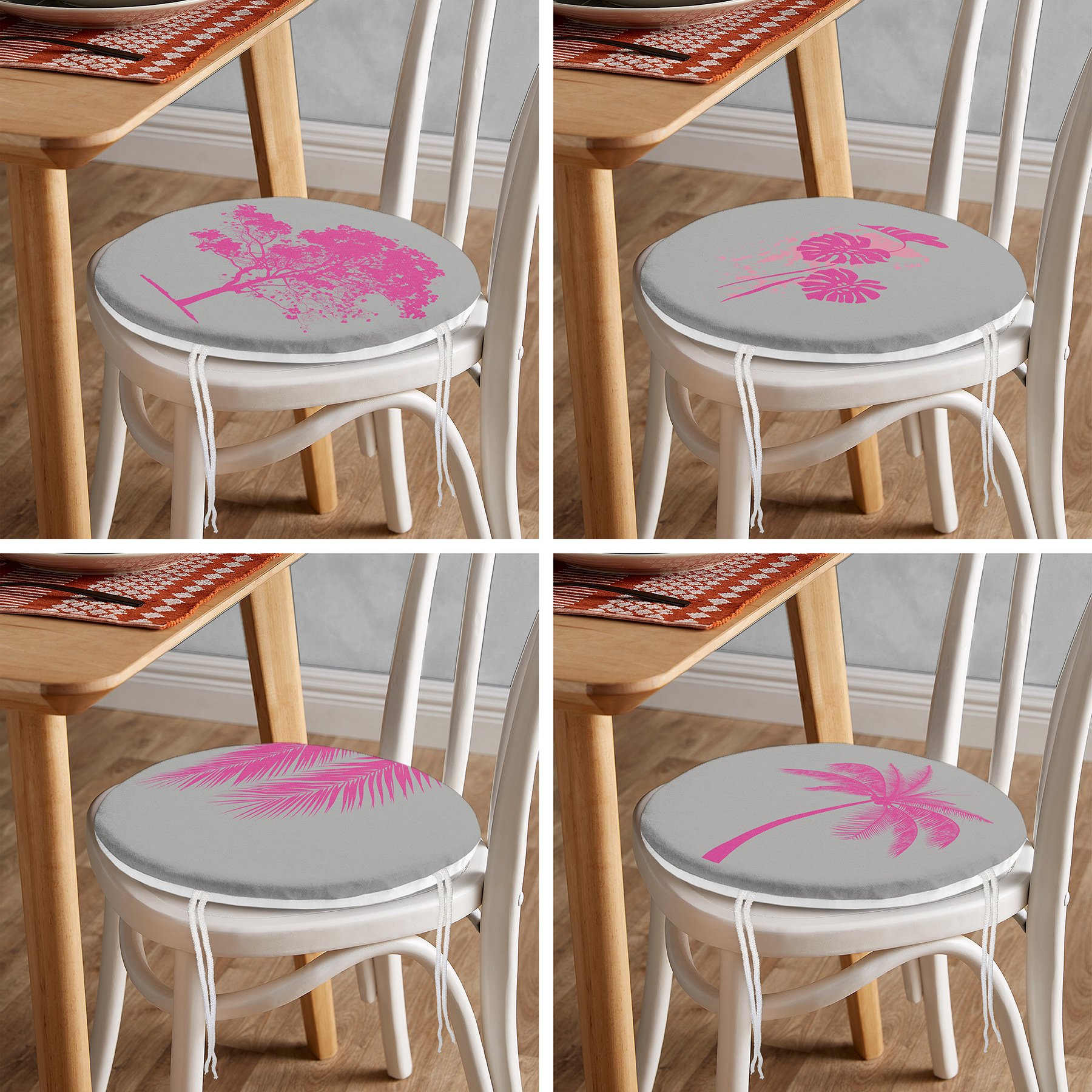 4’lü Gri Zeminde Fuşya Ağaç Motifli Dekoratif Dijital Baskılı Yuvarlak Fermuarlı Sandalye Minderi Seti