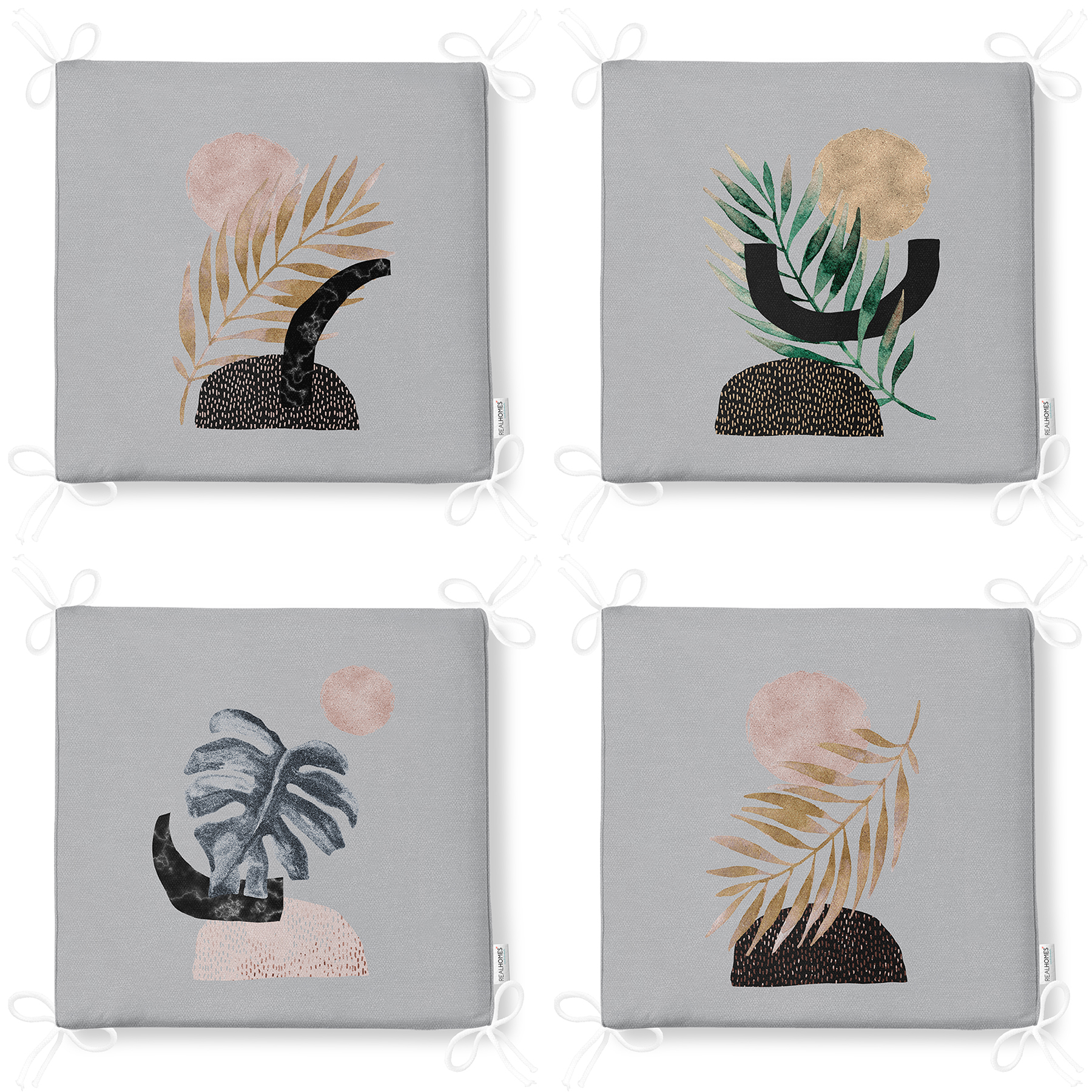 4'lü Gri Zeminde Gümüş Ve Gold Yaprak Tasarımlı Modern Fermuarlı Sandalye Minderi Seti Realhomes