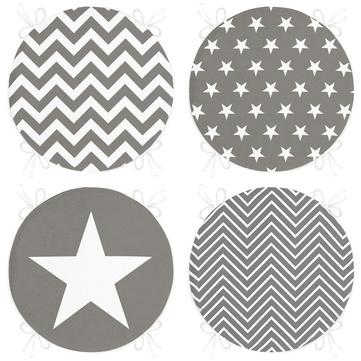 4’lü Gri Zigzag ve Yıldız Motifli Yuvarlak Fermuarlı Sandalye Minderi Seti