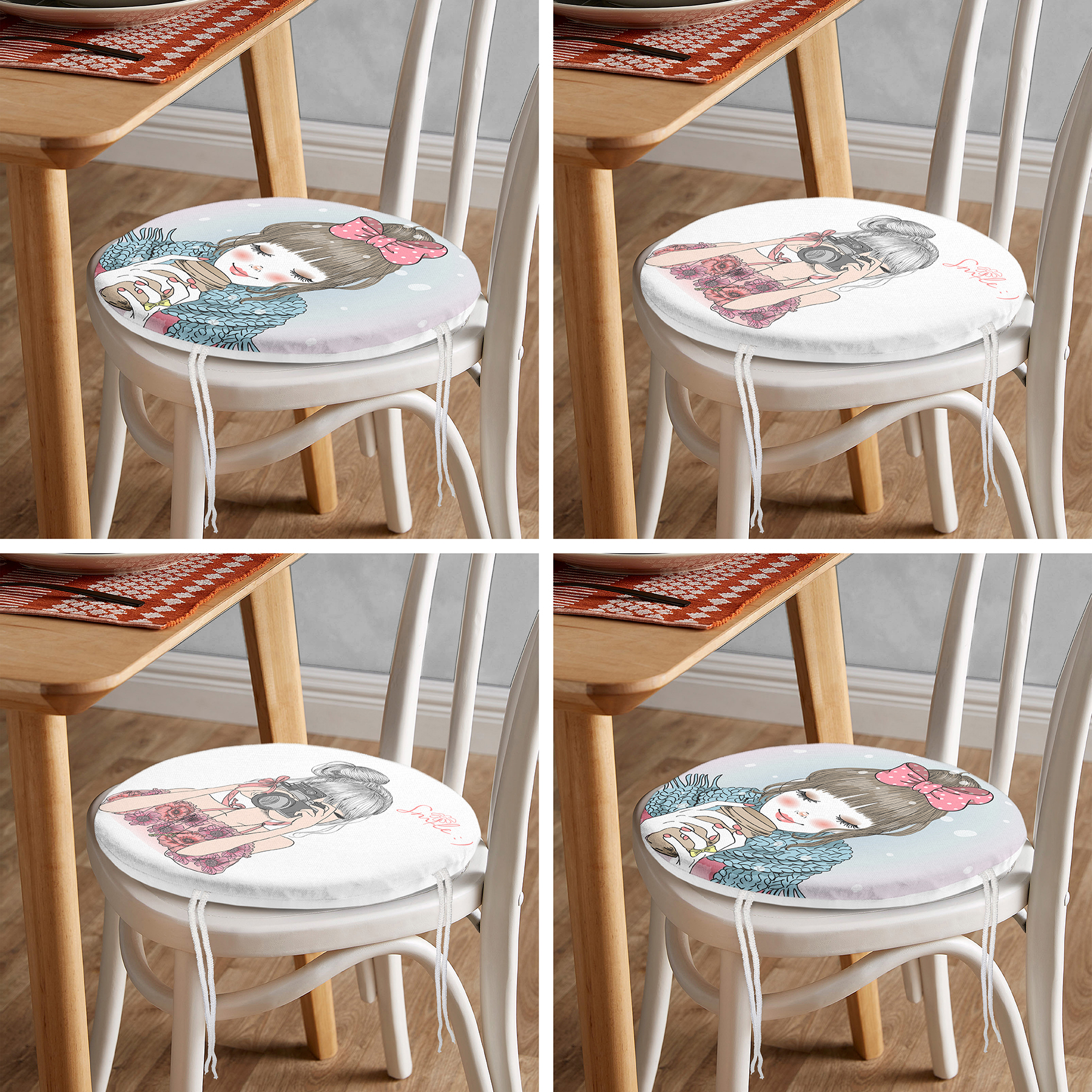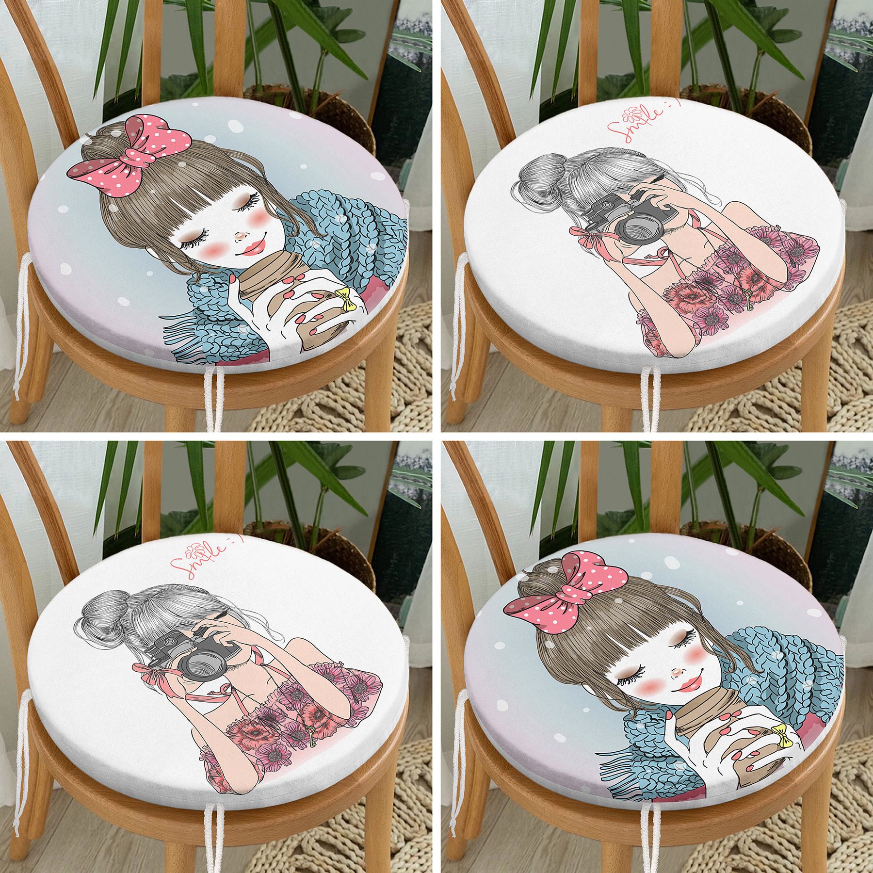 4'lü Kahve İçen ve Fotoğraf Çeken Kız Yuvarlak Fermuarlı Sandalye Minderi Seti Realhomes