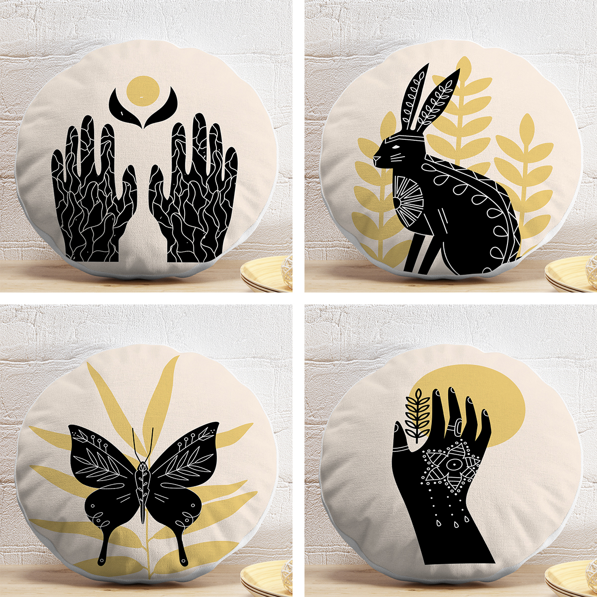 4’lü Kelebek & Mehndi Özel Tasarımlı Dijital Baskılı Modern Yuvarlak Yastık Kırlent Kılıf Seti