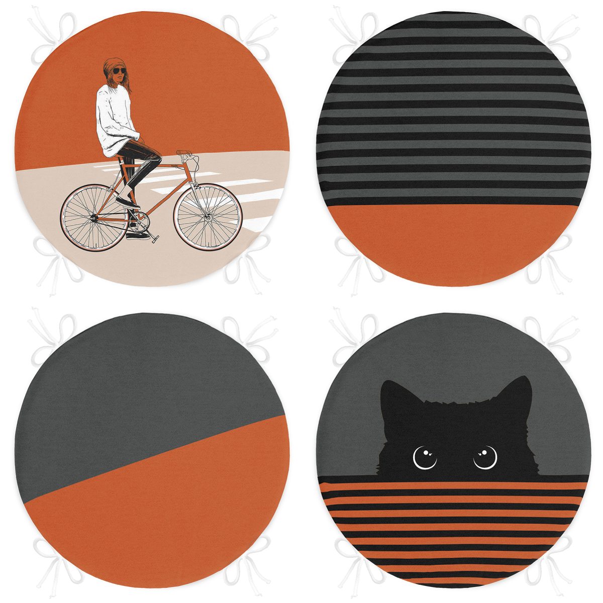4'lü Kiremit Renkli Bisikletli Adam Kedi Motifli Yuvarlak Fermuarlı Sandalye Minderi Seti Realhomes