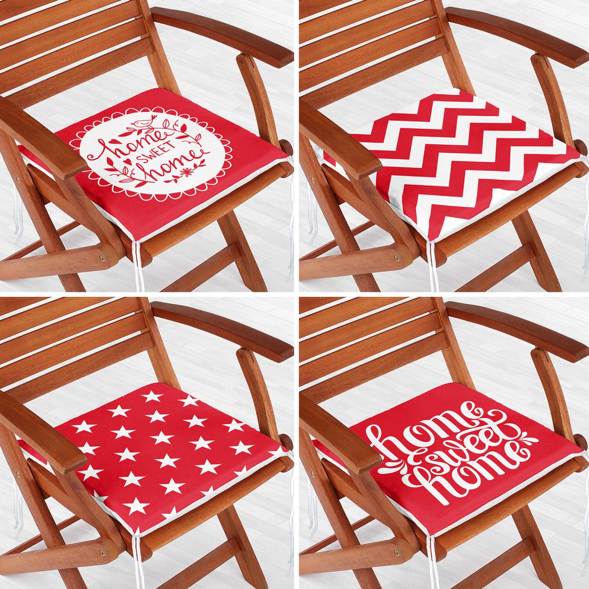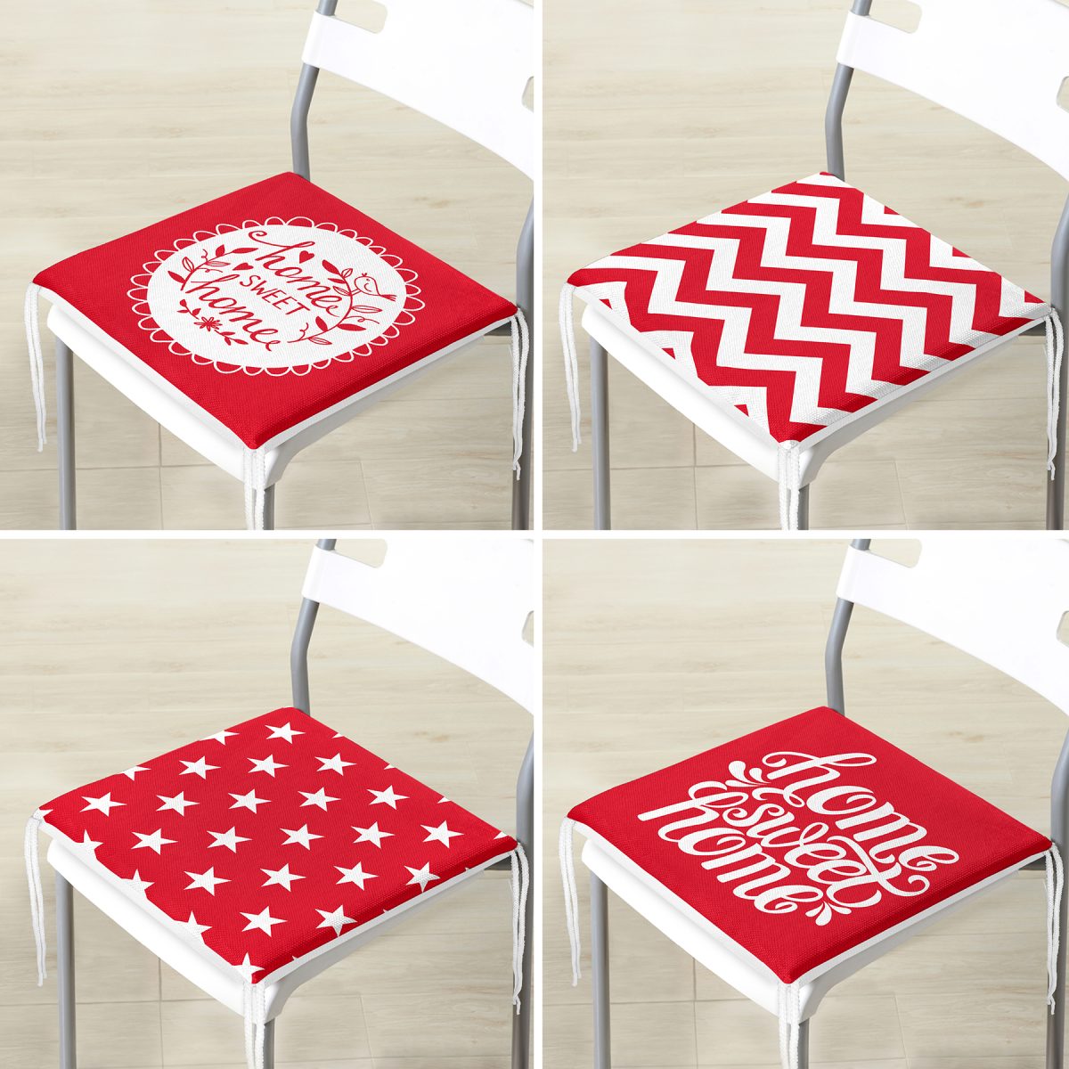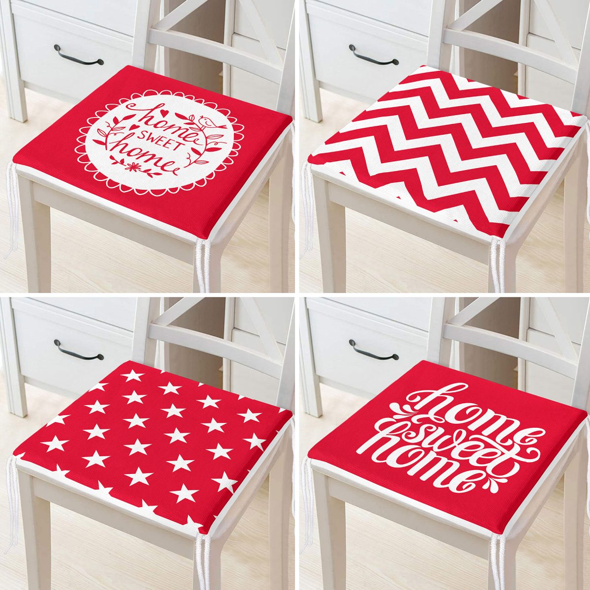4’lü Kırmızı Home Sweet Temalı Fermuarlı Sandalye Minderi Seti
