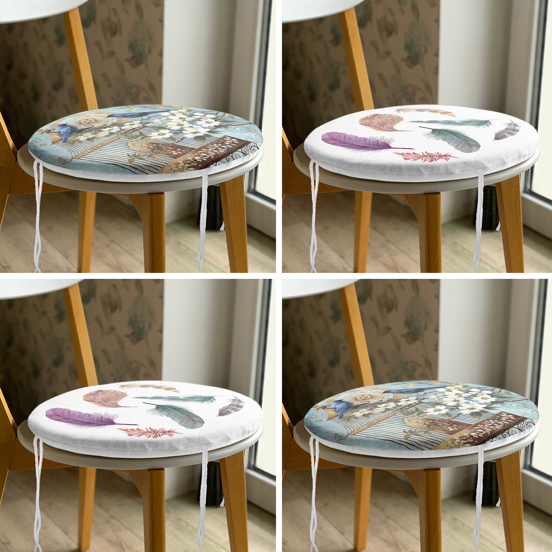 4’lü Kuş ve Tüy Modern Yuvarlak Fermuarlı Sandalye Minderi Seti