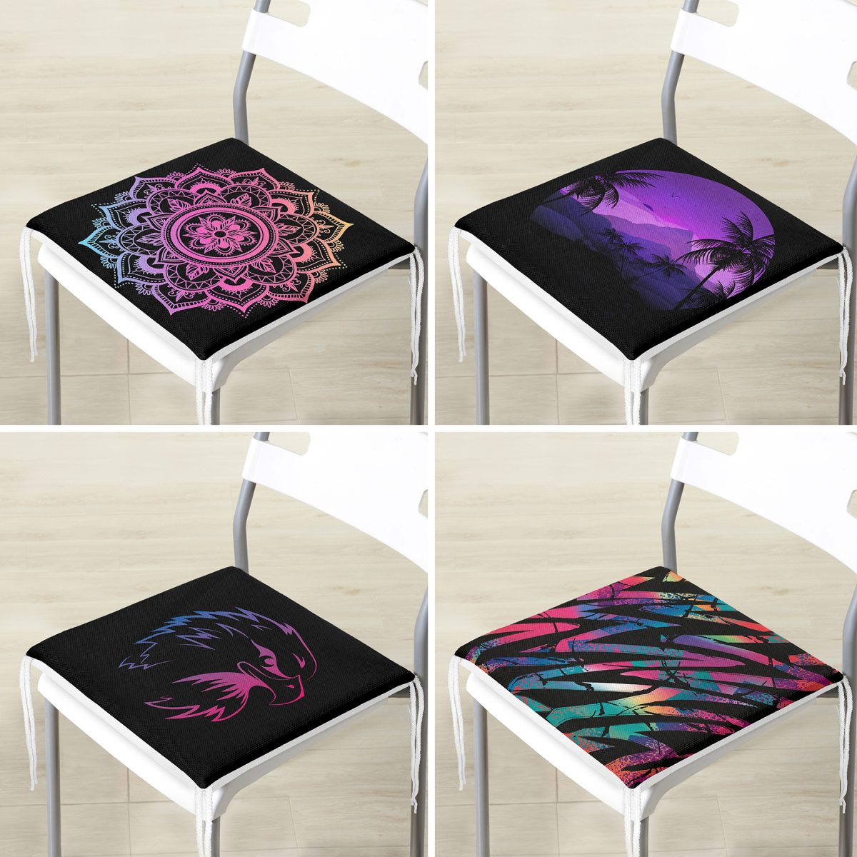 4’lü Neon Geometrik Çizim Tasarımlı Modern Dijital Baskılı Fermuarlı Sandalye Minderi Seti