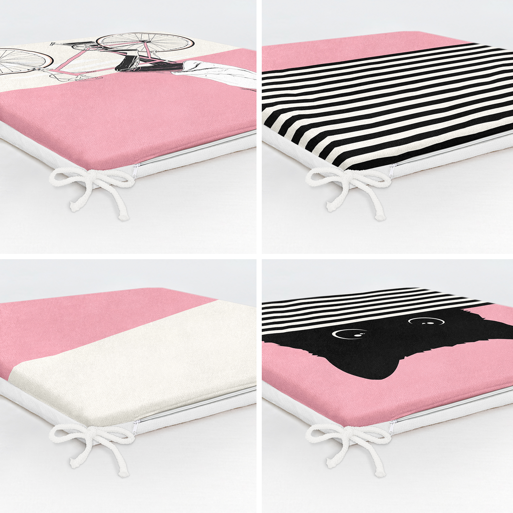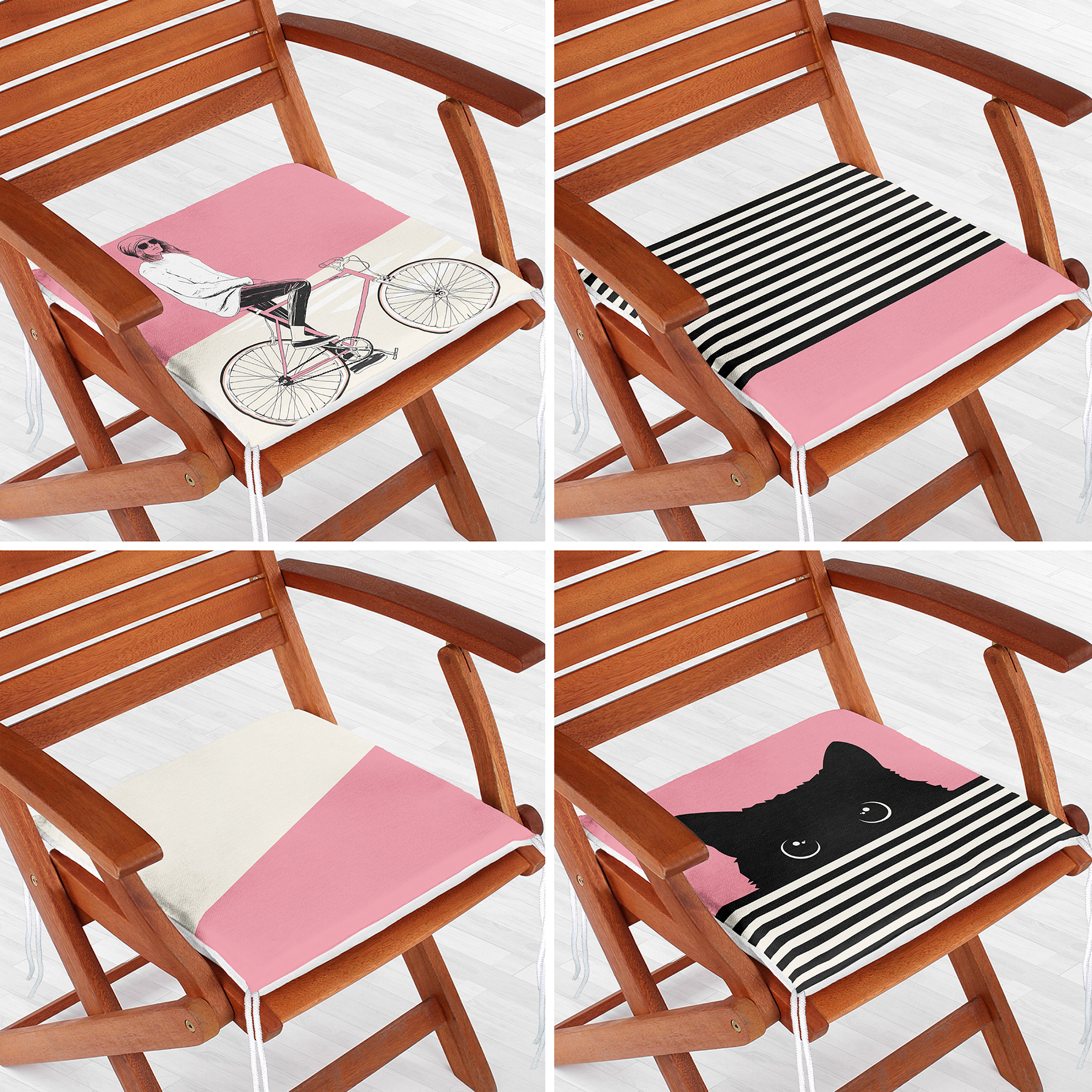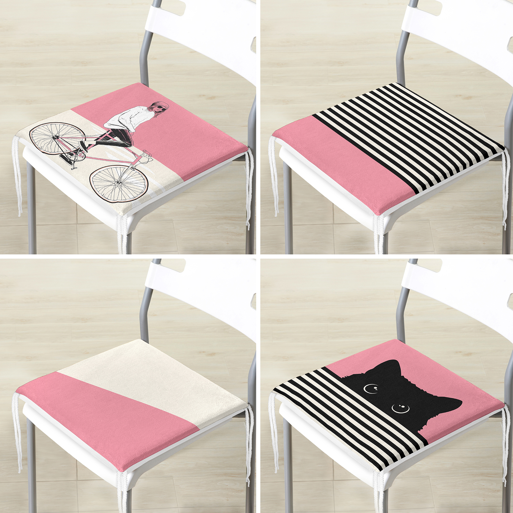 4'lü Pembe Bisikletli Adam Kedi Temalı Fermuarlı Sandalye Minderi Seti Realhomes