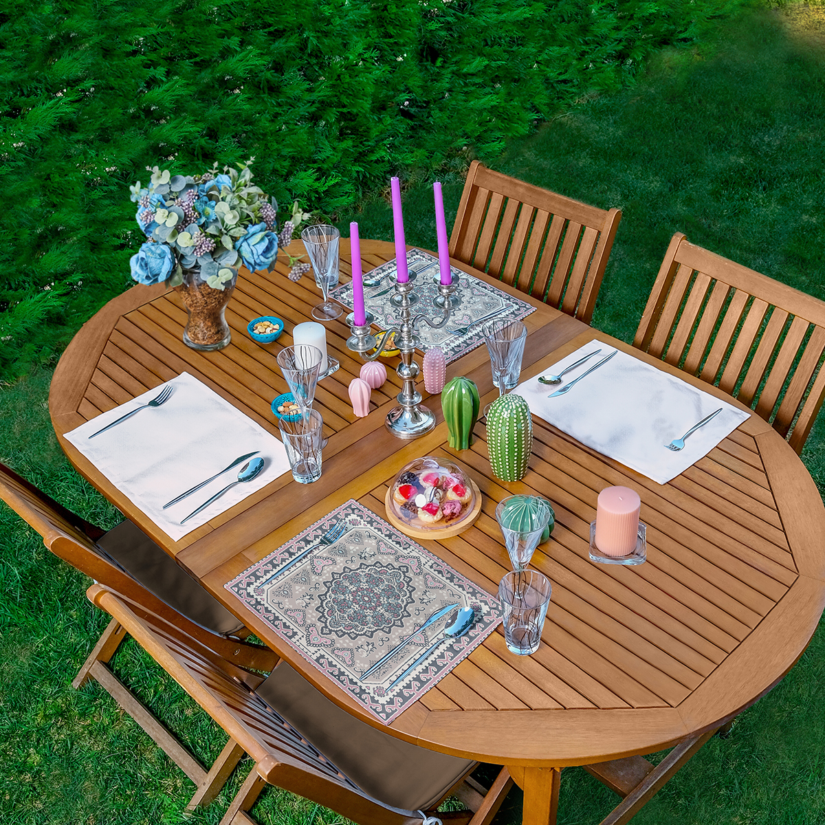 RealHomes Dijital Baskılı 4’lü Amerikan Servis seti, kumaş seçimi ve desen detaylarıyla şık bir dekorasyon ögesi olarak kullanımınıza sunulmaktadır. Her bir desen RealHomes tasarımcıları tarafından özenle tasarlanmış ve satışa sunulmuştur. Fotoğraf kalitesinde canlı ve gerçekçi baskılarımız yıkamaya ve kullanıma bağlı olarak solma yapmaz, yıllar boyu ilk günkü özelliğini korur.