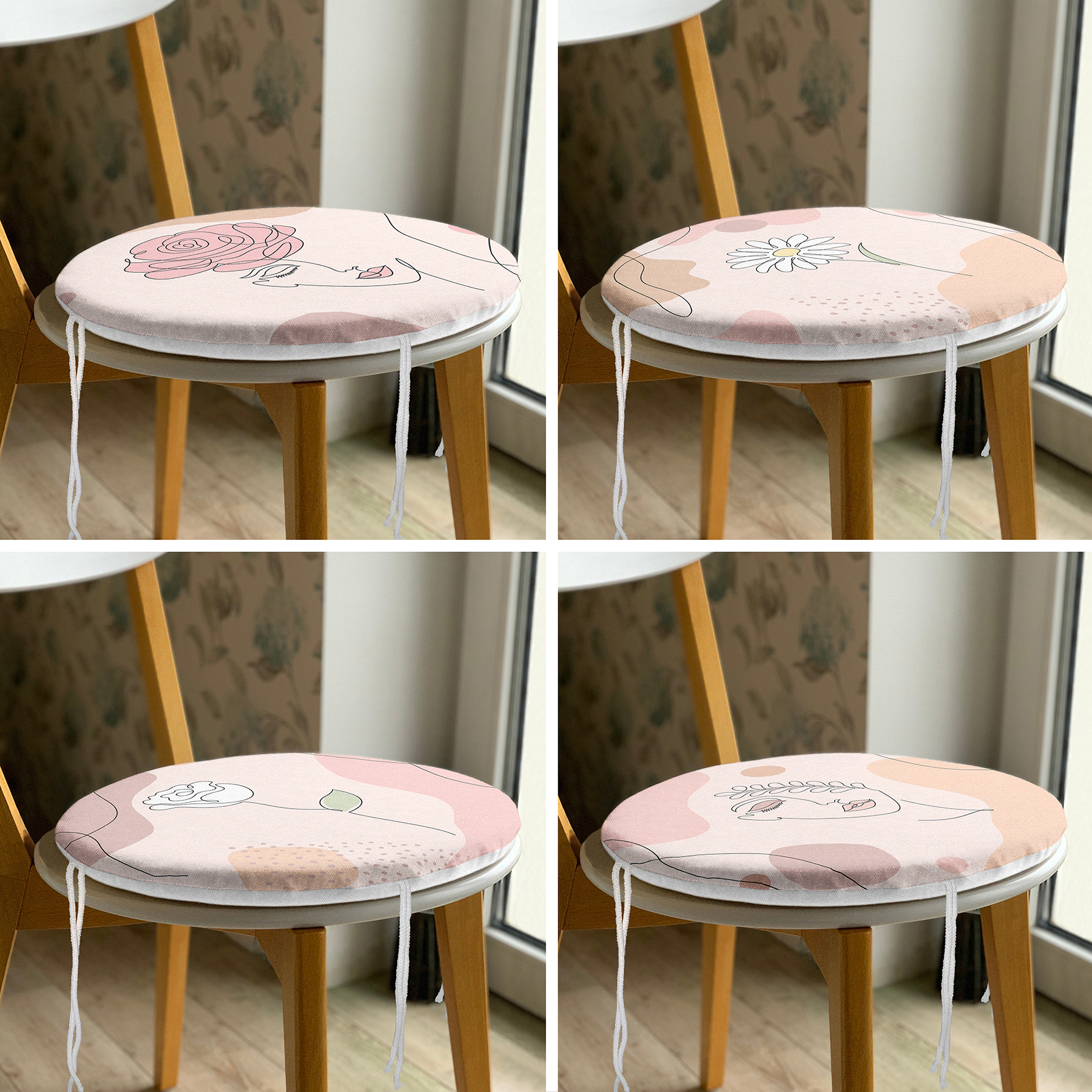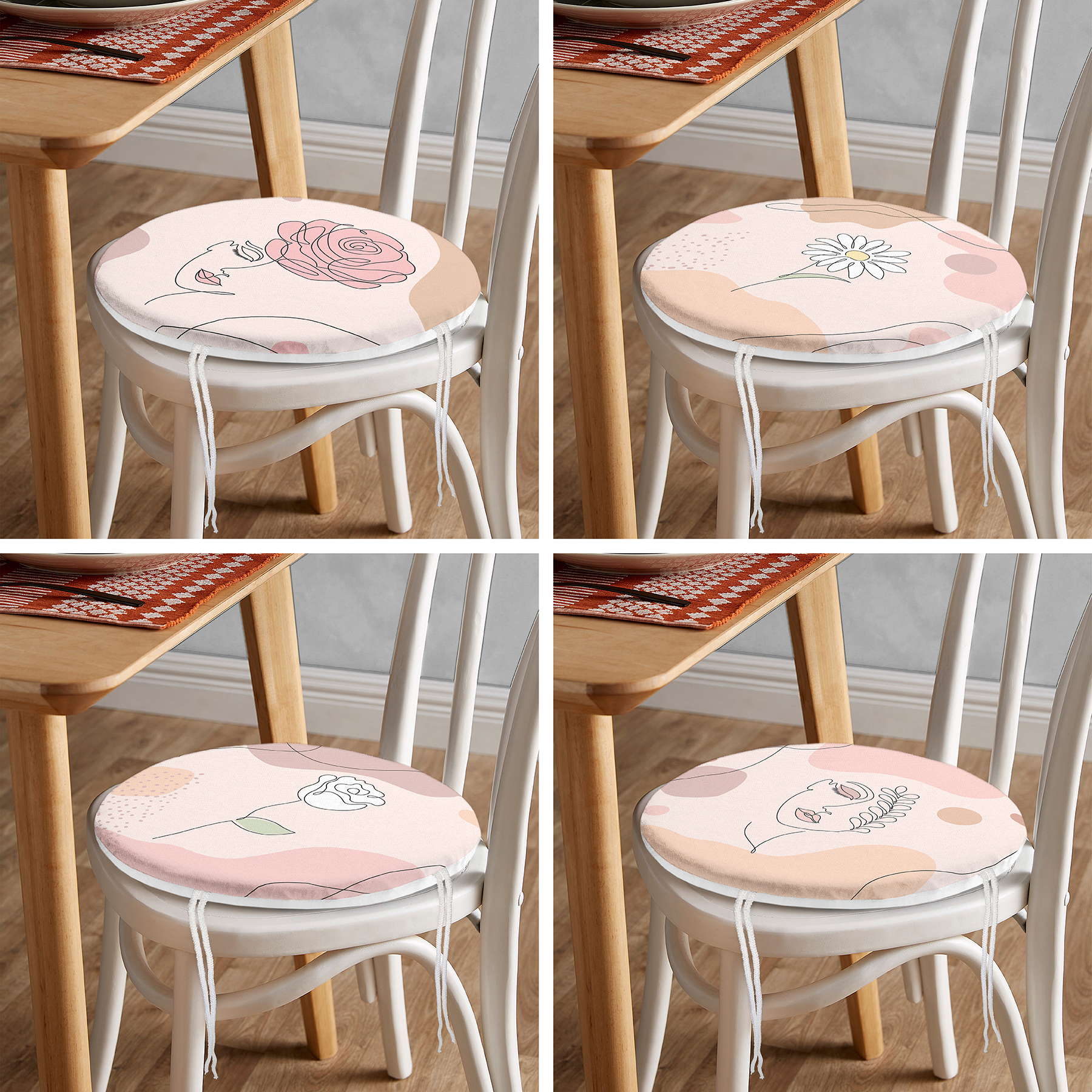 4'lü Pembe Zemin Üzerinde Çiçek Motifli Dekoratif Yuvarlak Fermuarlı Sandalye Minderi Seti Realhomes