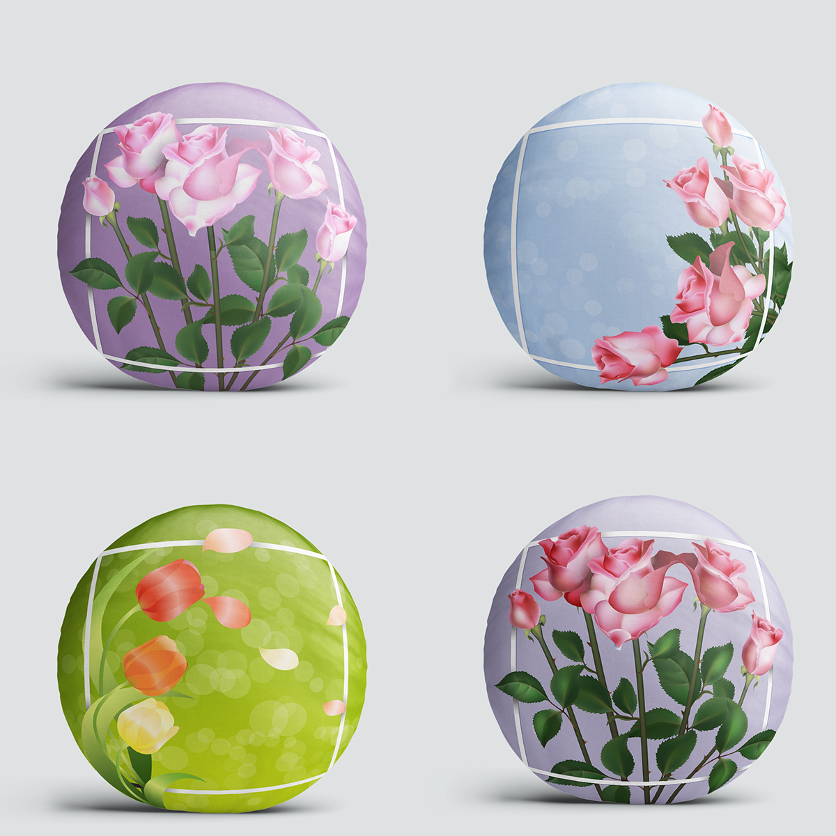 4’lü Renkli Zemin Gül Demetleri Özel Tasarım Dijital Baskılı Yuvarlak Yastık Kırlent Kılıf Seti