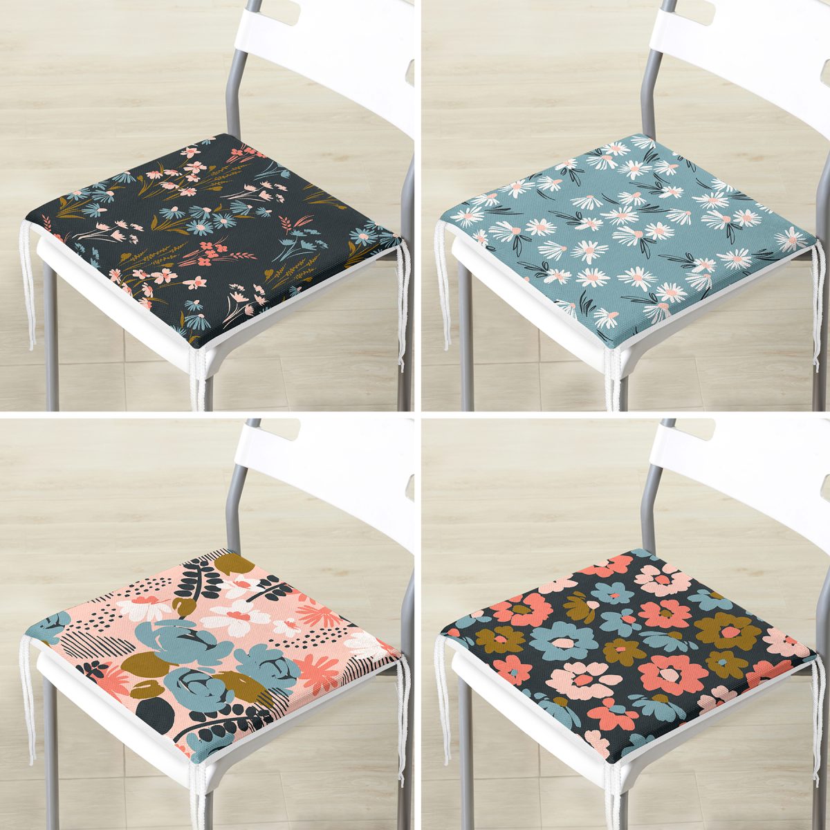 4’lü Renkli Zemin Üzerinde Çiçek Desenli Modern Fermuarlı Sandalye Minderi Seti