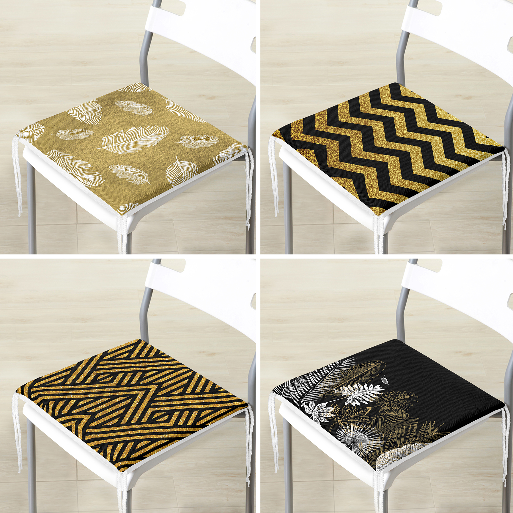 4’lü Renkli Zemin Üzerinde Gold Detaylı Geometrik Desenli Modern Fermuarlı Sandalye Minderi Seti