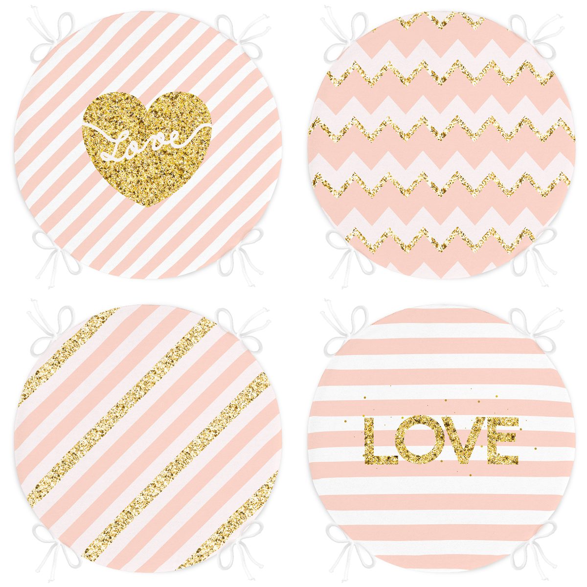 4’lü Renkli Zemin Üzerinde Gold Detaylı Love Yazılı Modern Yuvarlak Fermuarlı Sandalye Minderi Seti