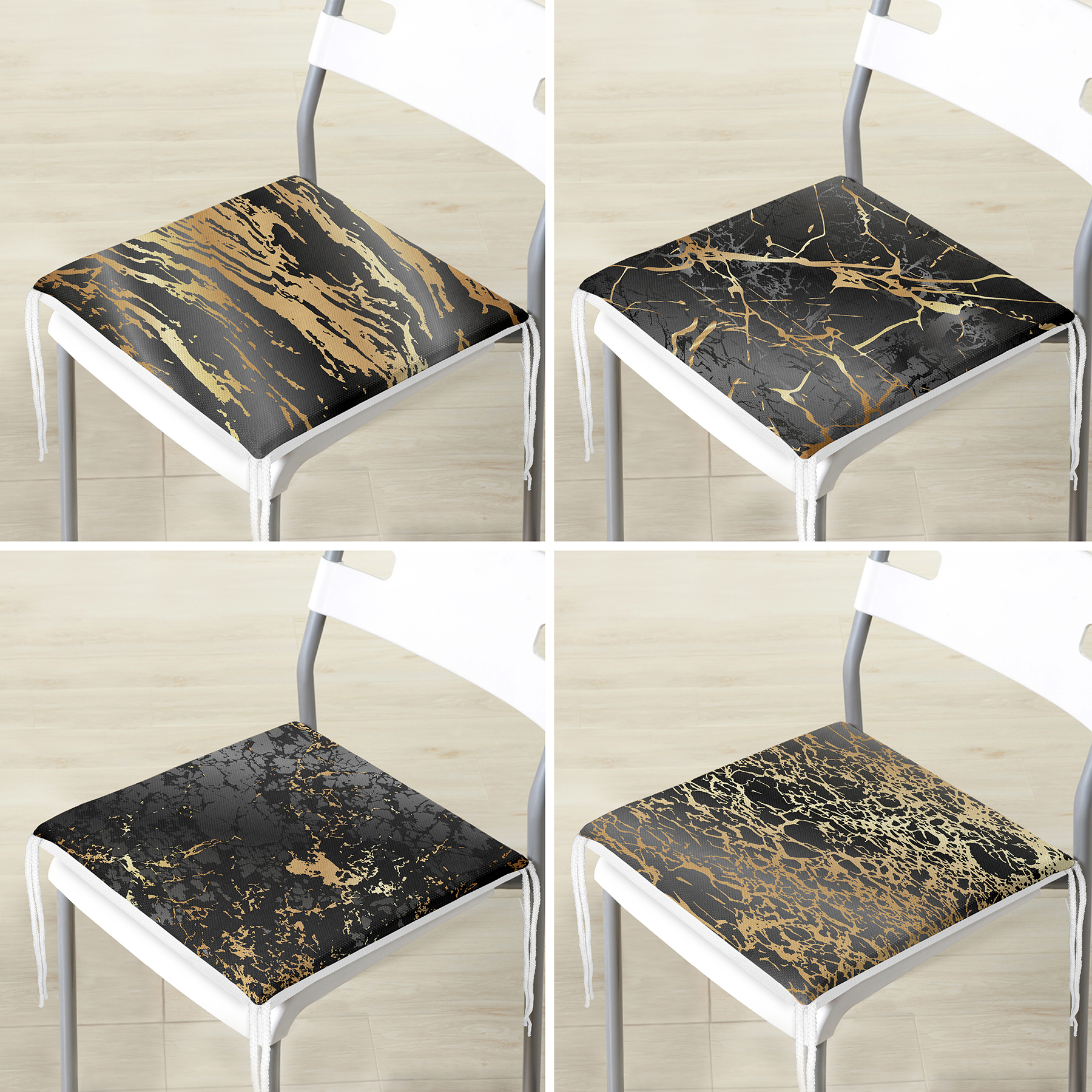 4’lü Renkli Zemin Üzerinde Gold Detaylı Mermer Desenli Modern Fermuarlı Sandalye Minderi Seti