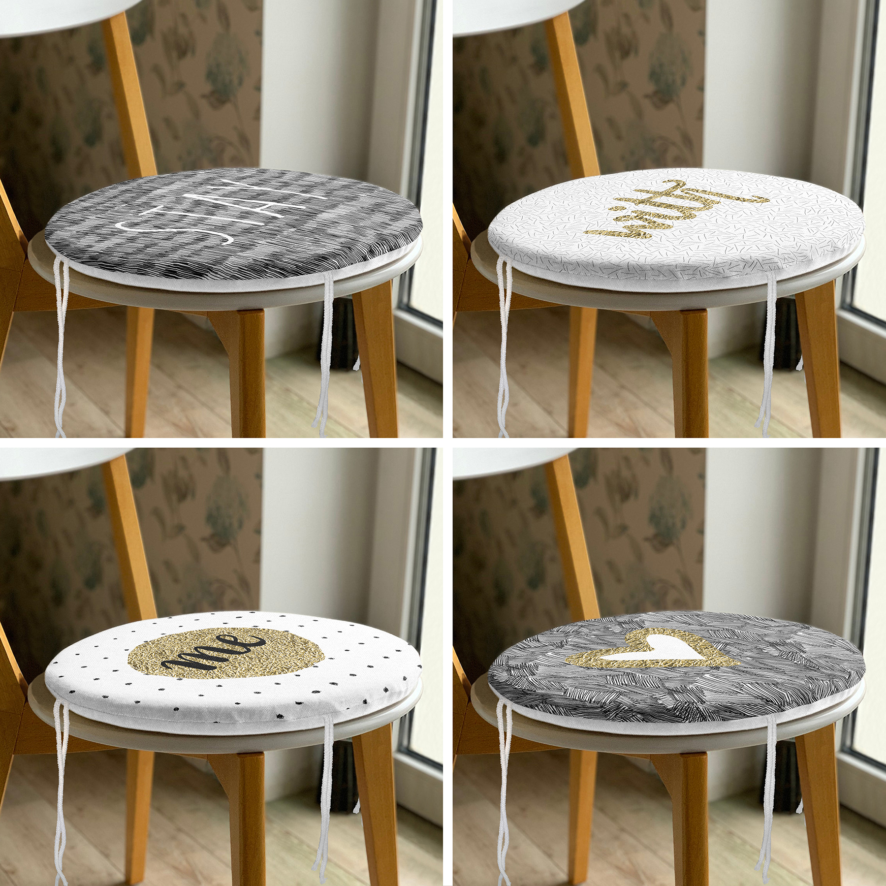 4'lü Renkli Zemin Üzerinde Gold Detaylı Yazılı Modern Yuvarlak Fermuarlı Sandalye Minderi Seti Realhomes