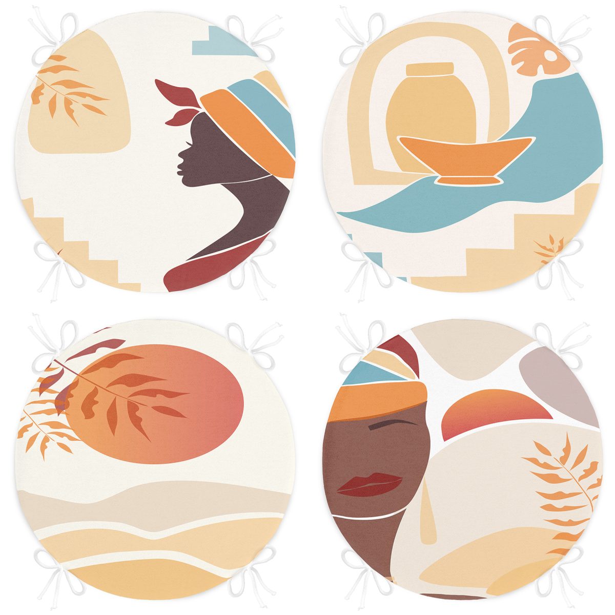 4'lü Renkli Zemin Üzerinde Onedraw Çizimli Afrika Kadın Desenli Modern Yuvarlak Fermuarlı Sandalye Minderi Seti Realhomes