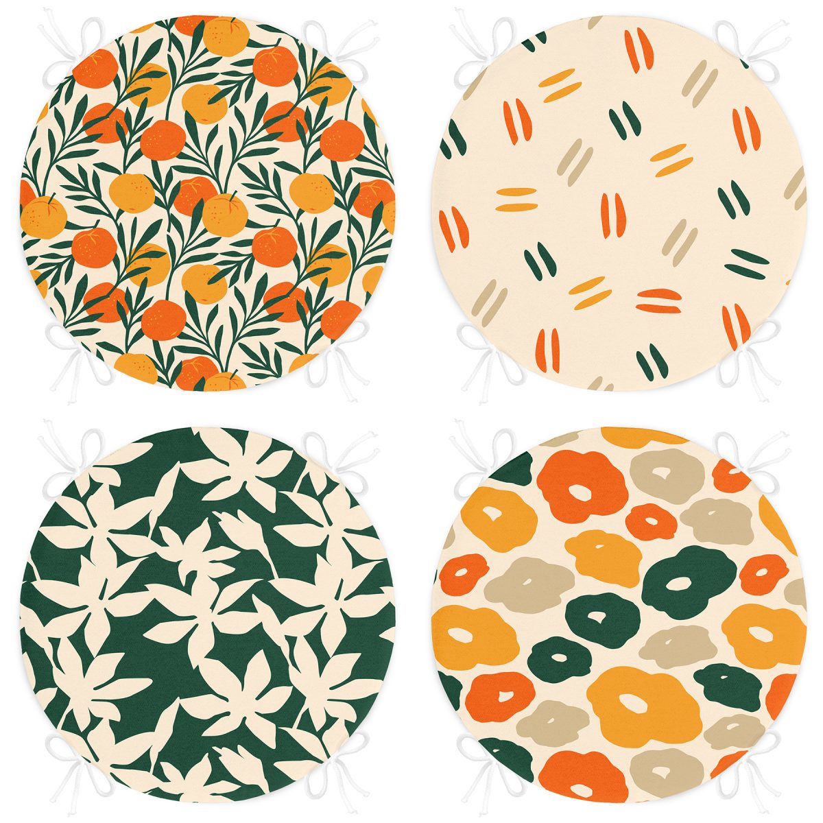 4’lü Renkli Zemin Üzerinde Onedraw Çizimli Modern Yuvarlak Fermuarlı Sandalye Minderi Seti