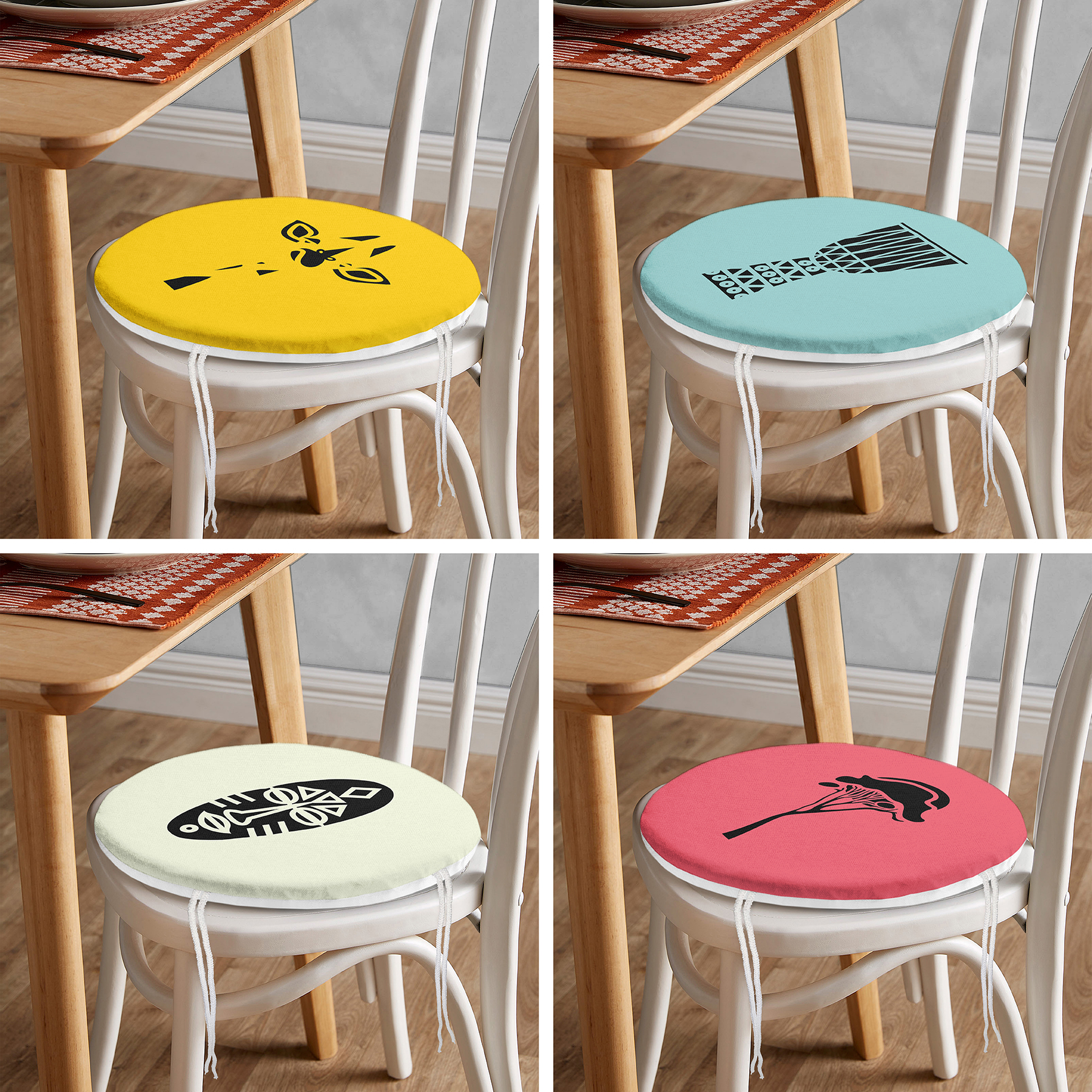 4’lü Renkli Zemin Üzerinde Onedraw Çizimli Modern Yuvarlak Fermuarlı Sandalye Minderi Seti