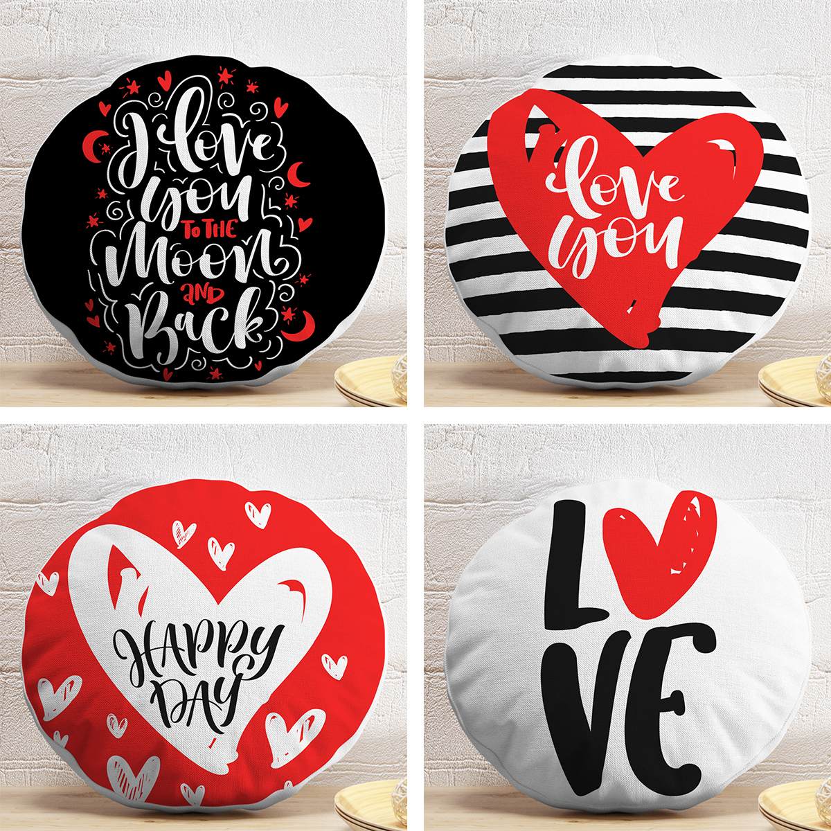 4’lü Sevgililer Günü Konseptli Özel Tasarım Modern Kombin Yuvarlak Yastık Kırlent Kılıf Seti