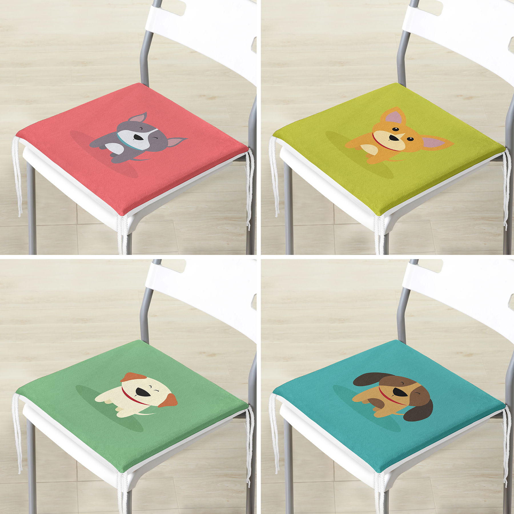 4’lü Sevimli Köpekcikler Fermuarlı Sandalye Minderi Seti