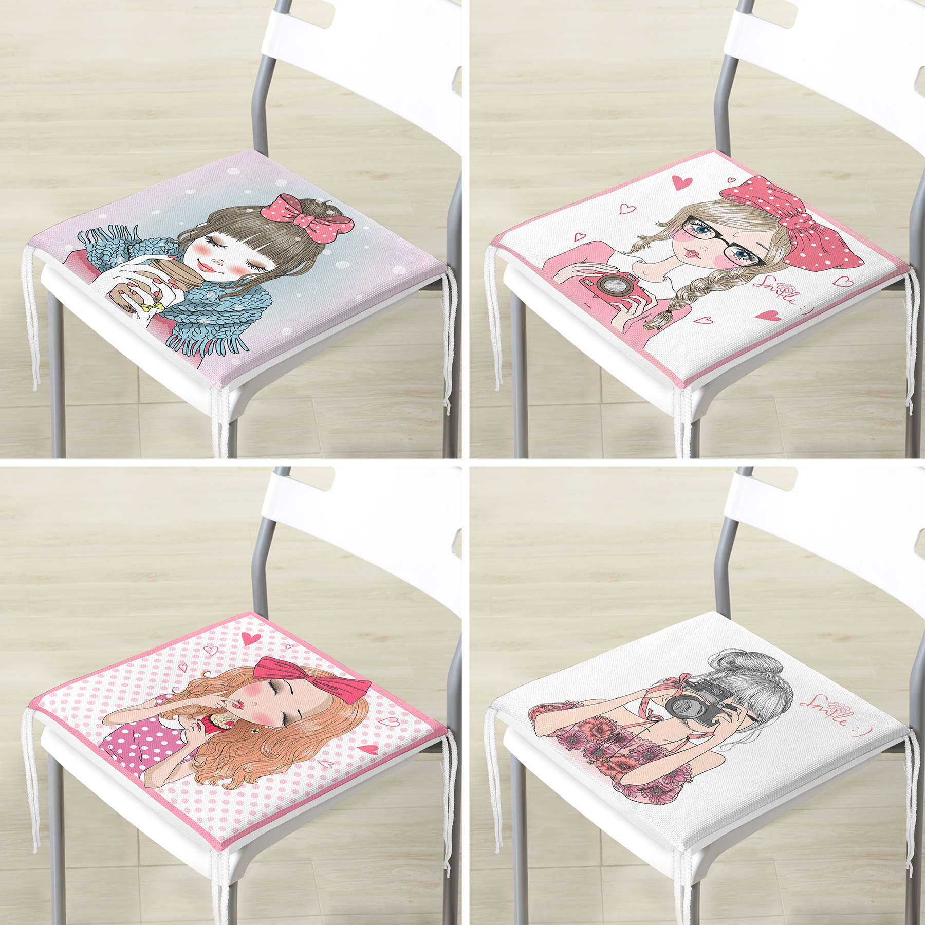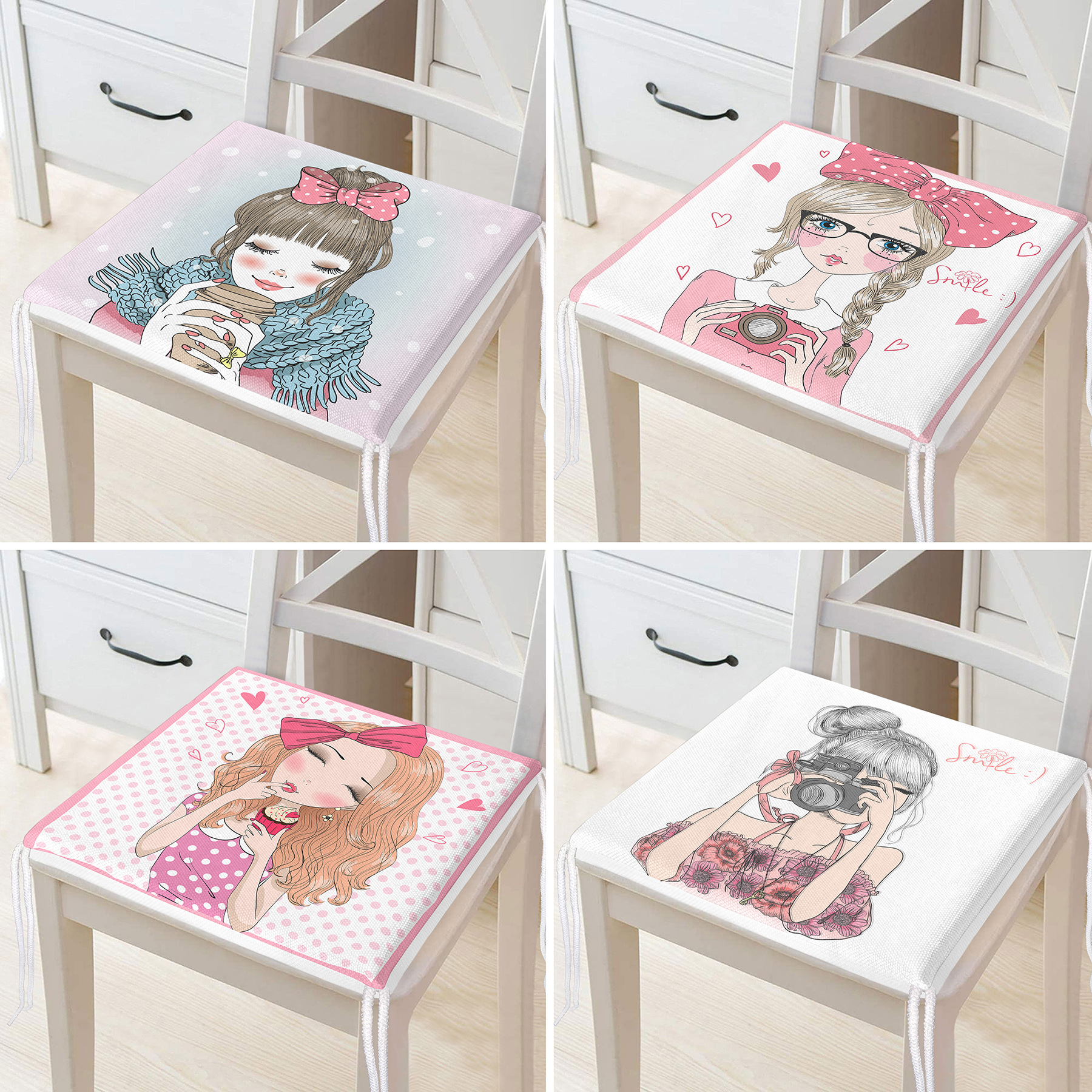 4’lü Sevimli Pop-Art Çizimli Kızlar Fermuarlı Sandalye Minderi Seti