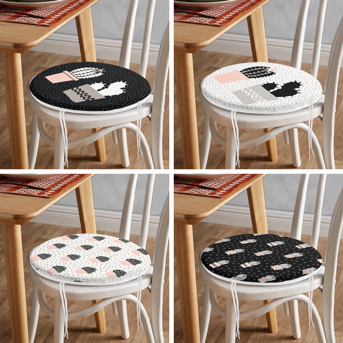 4’lü Siyah Beyaz Zemin Kaktüs Çizimli Dijital Baskılı Modern Yuvarlak Fermuarlı Sandalye Minderi Seti