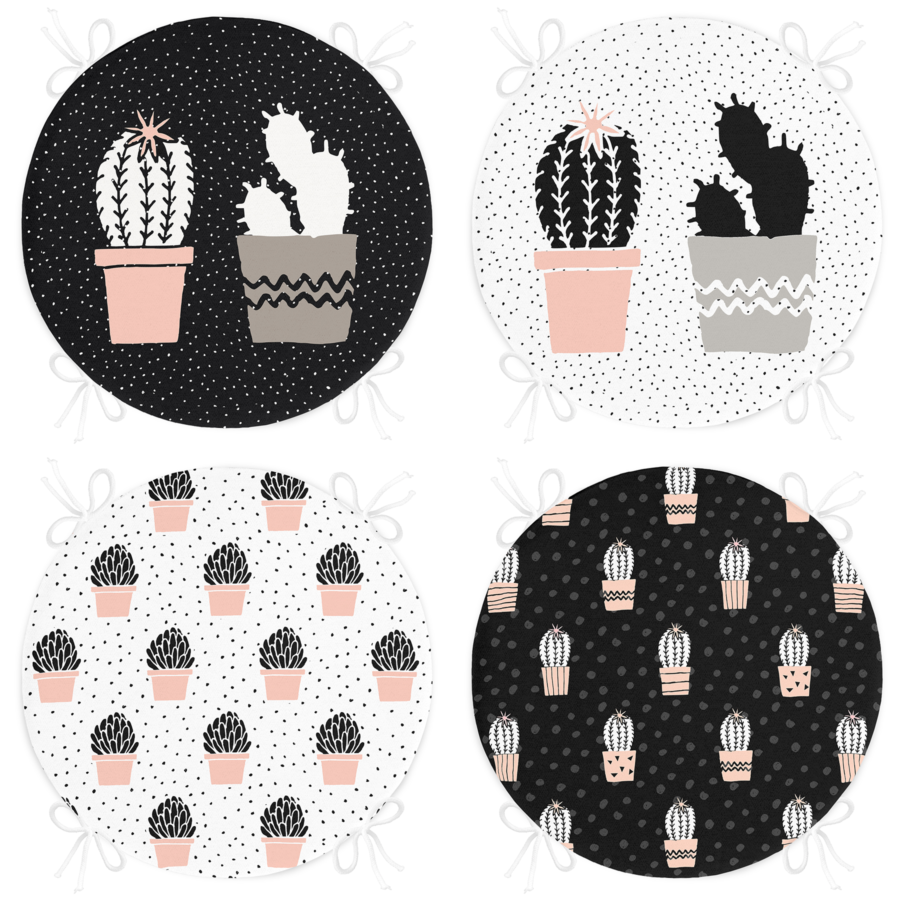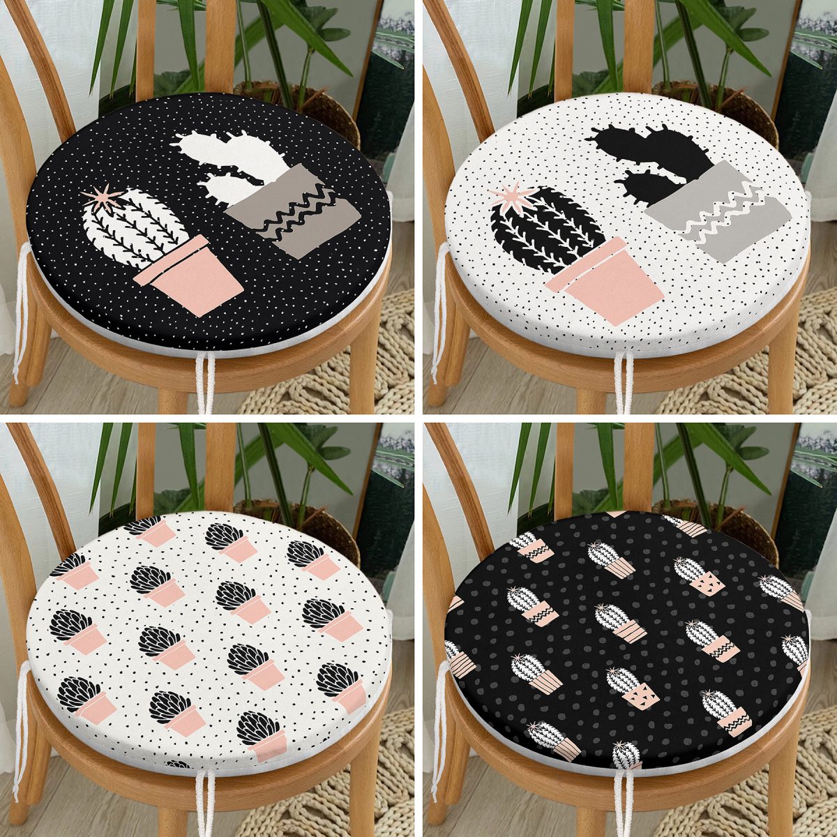 4'lü Siyah Beyaz Zemin Kaktüs Çizimli Dijital Baskılı Modern Yuvarlak Fermuarlı Sandalye Minderi Seti Realhomes