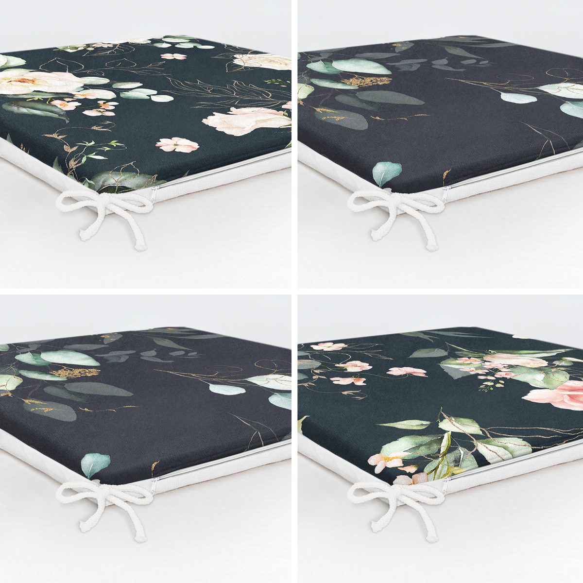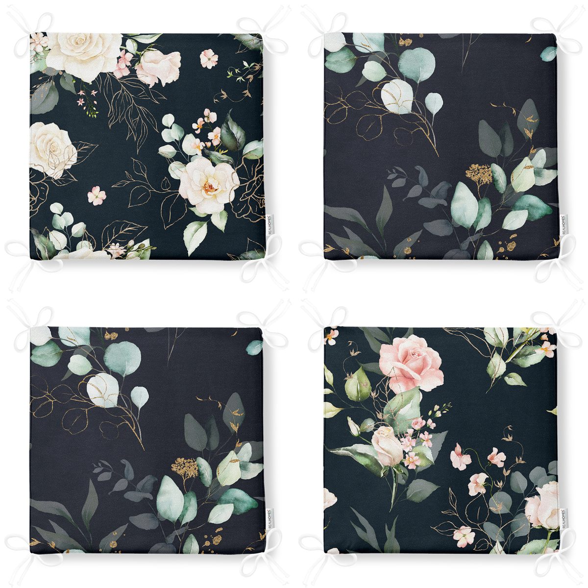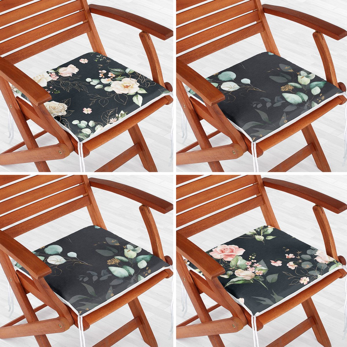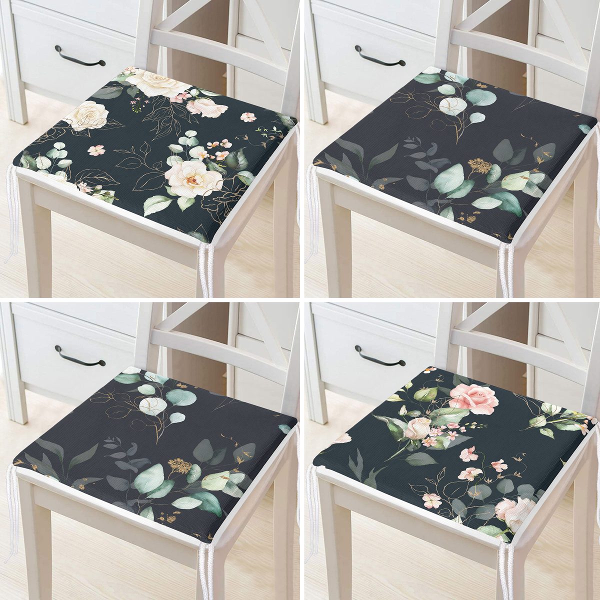 4’lü Siyah Zemin Üzerinde Çiçek Desenli Modern Fermuarlı Sandalye Minderi Seti