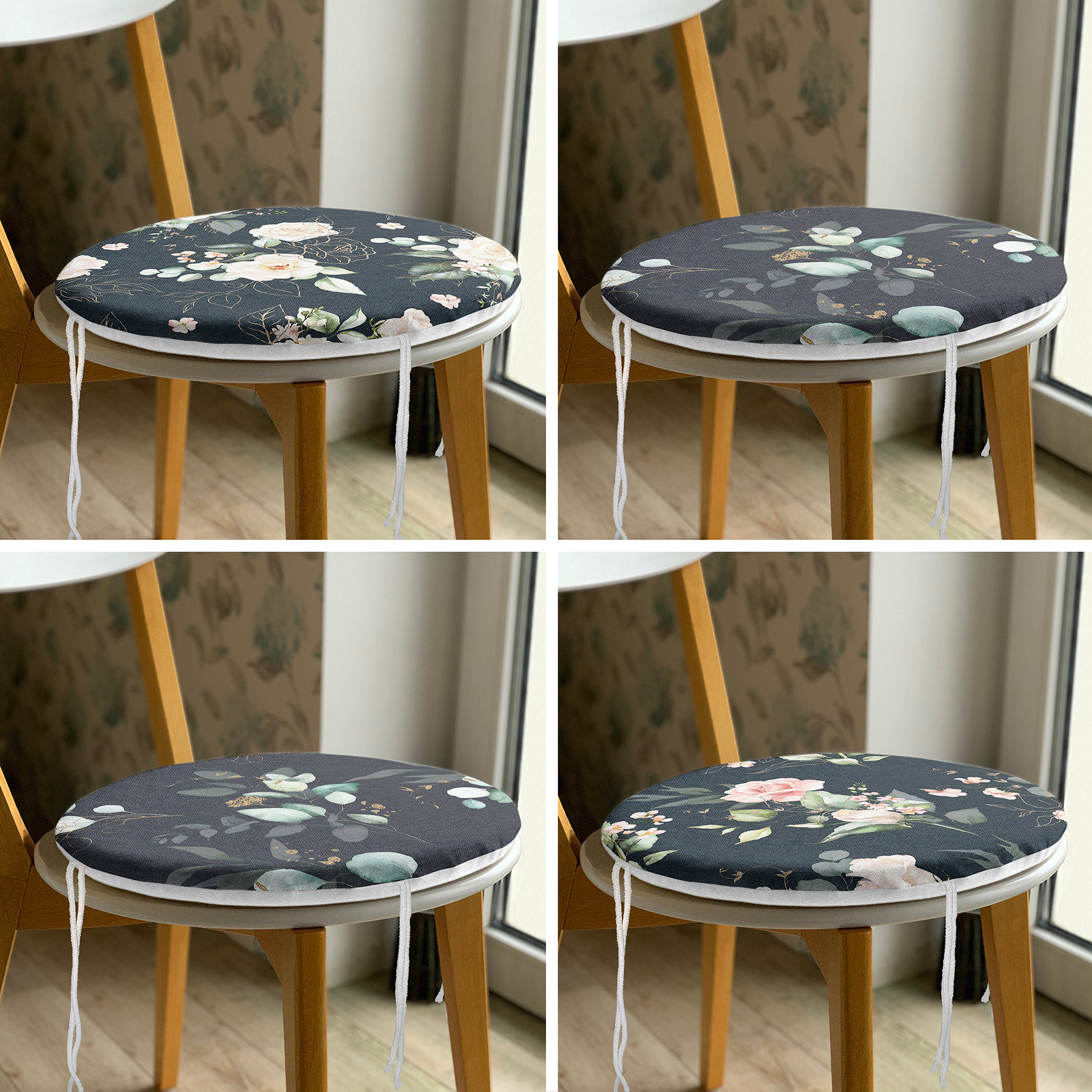 4’lü Siyah Zemin Üzerinde Çiçek Desenli Modern Yuvarlak Fermuarlı Sandalye Minderi Seti