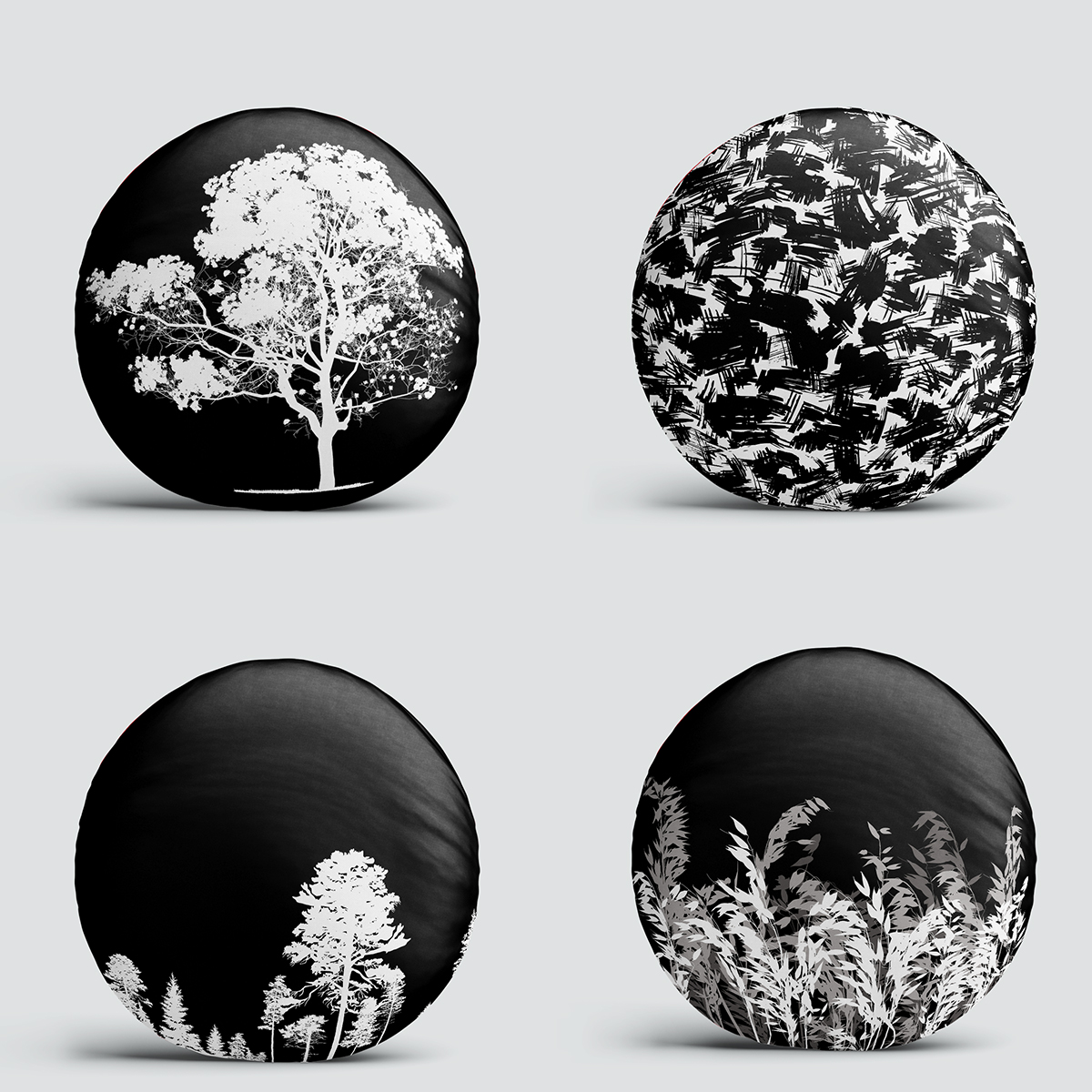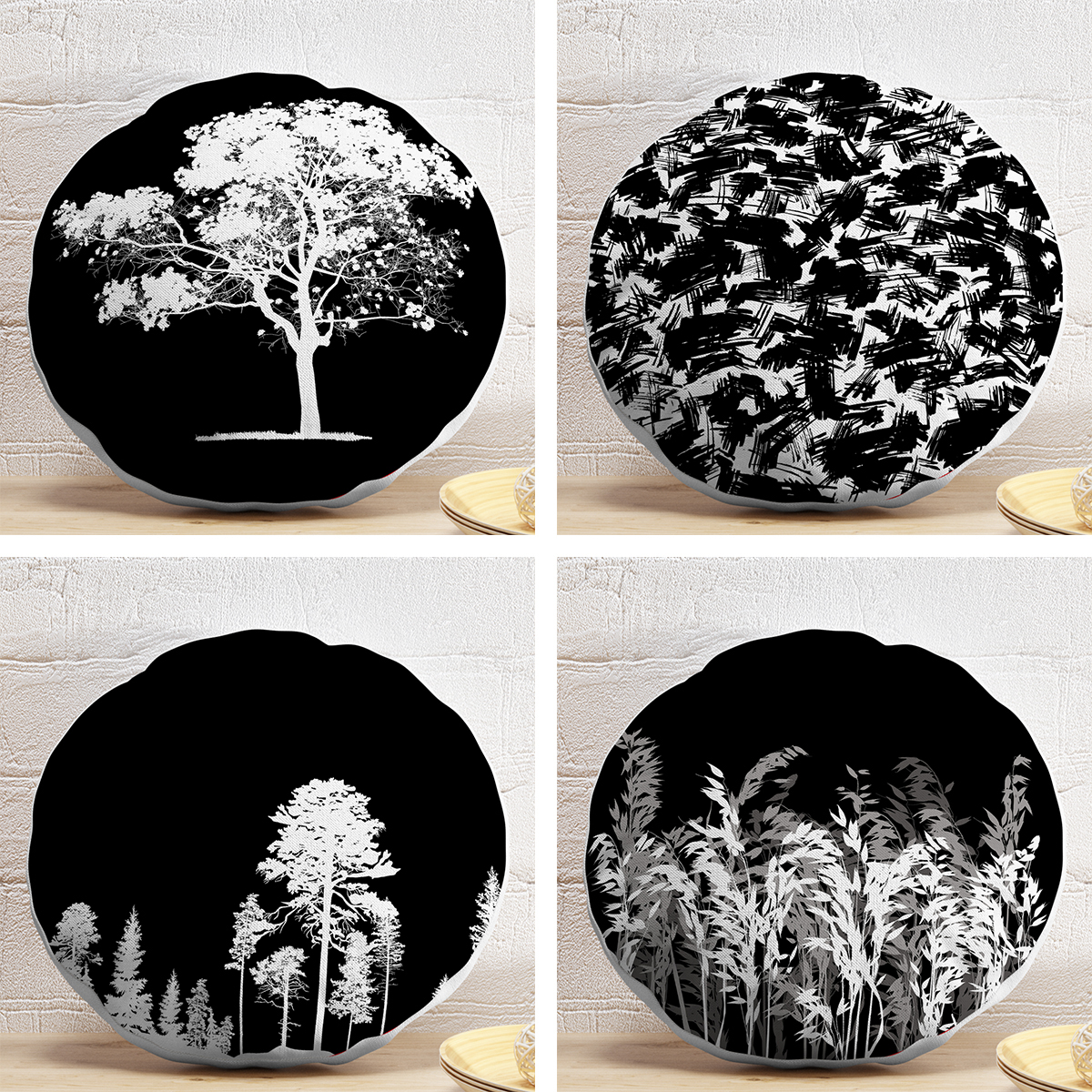4’lü Siyah Zeminde Ağaç Motifli Dijital Baskılı Özel Tasarım Yuvarlak Yastık Kırlent Kılıf Seti