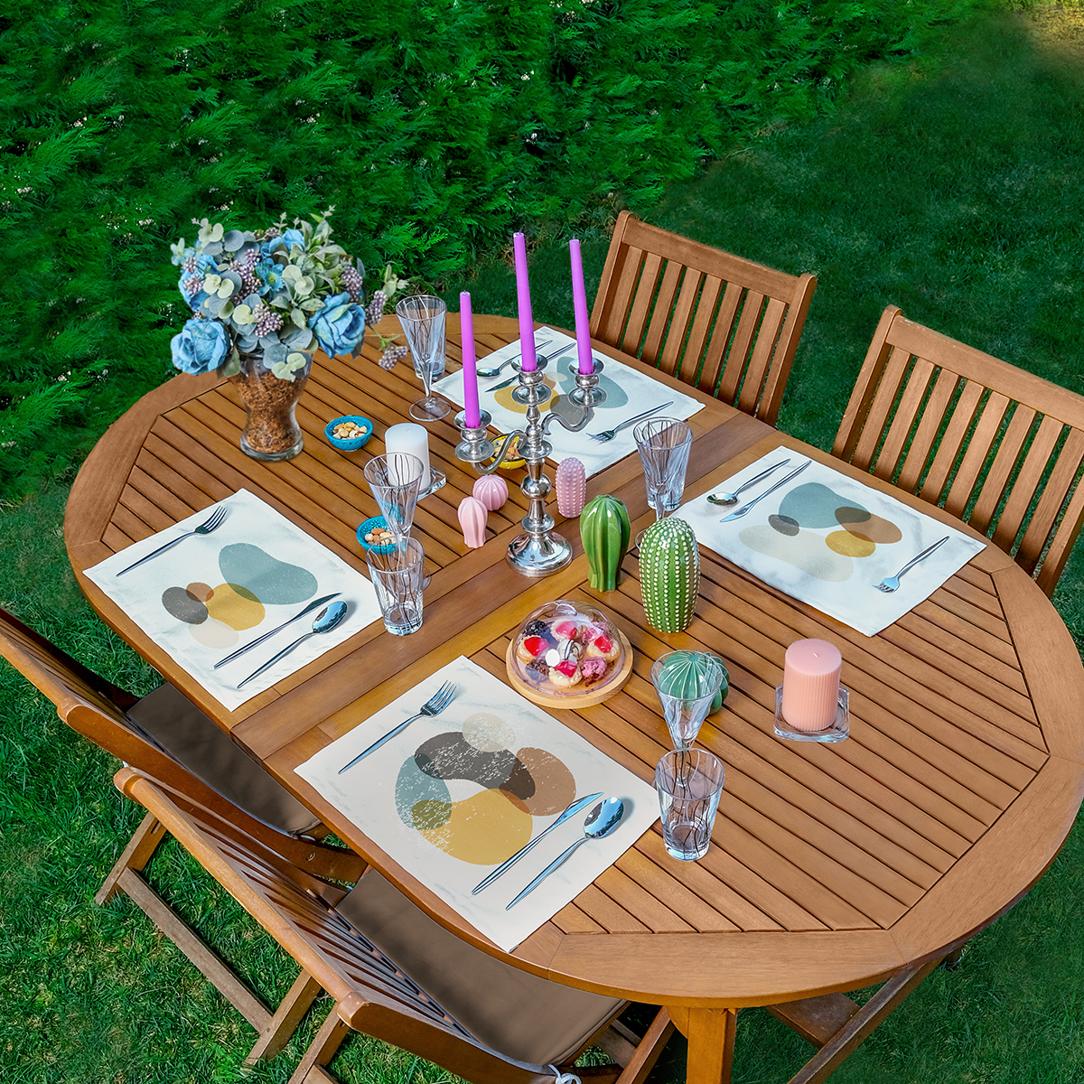 RealHomes Dijital Baskılı 4’lü Amerikan Servis seti, kumaş seçimi ve desen detaylarıyla şık bir dekorasyon ögesi olarak kullanımınıza sunulmaktadır. Her bir desen RealHomes tasarımcıları tarafından özenle tasarlanmış ve satışa sunulmuştur. Fotoğraf kalitesinde canlı ve gerçekçi baskılarımız yıkamaya ve kullanıma bağlı olarak solma yapmaz, yıllar boyu ilk günkü özelliğini korur.