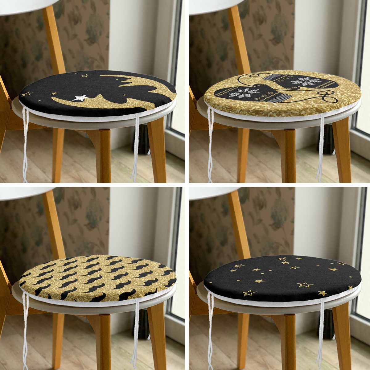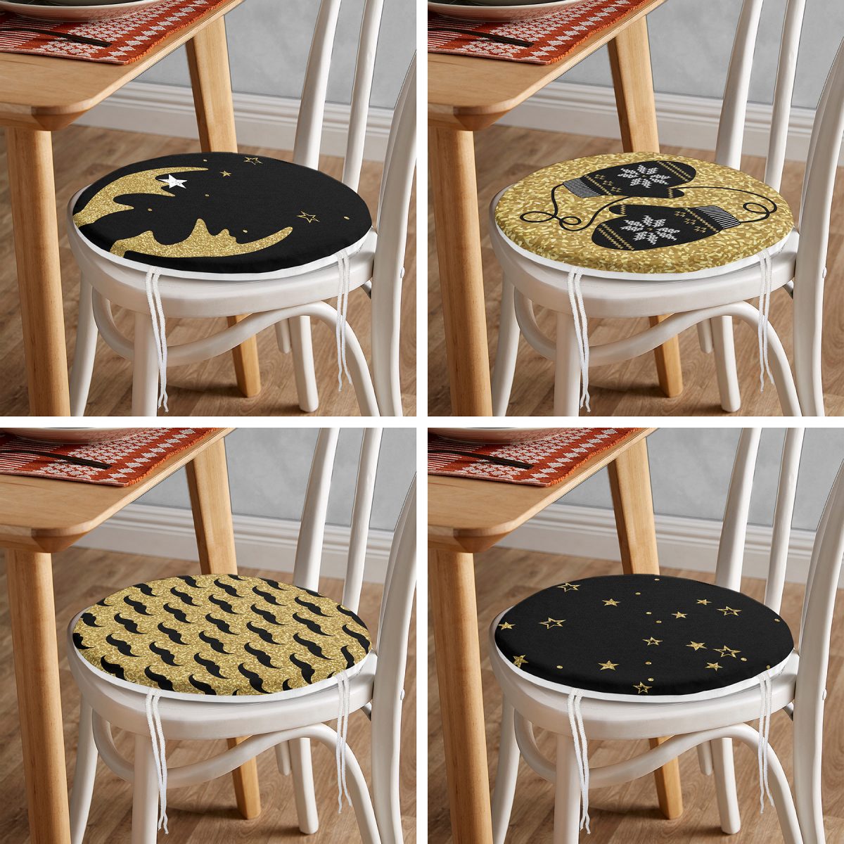4’lü Yılbaşı Konseptli Altın Varaklı Özel Tasarım Modern Yuvarlak Fermuarlı Sandalye Minderi Seti