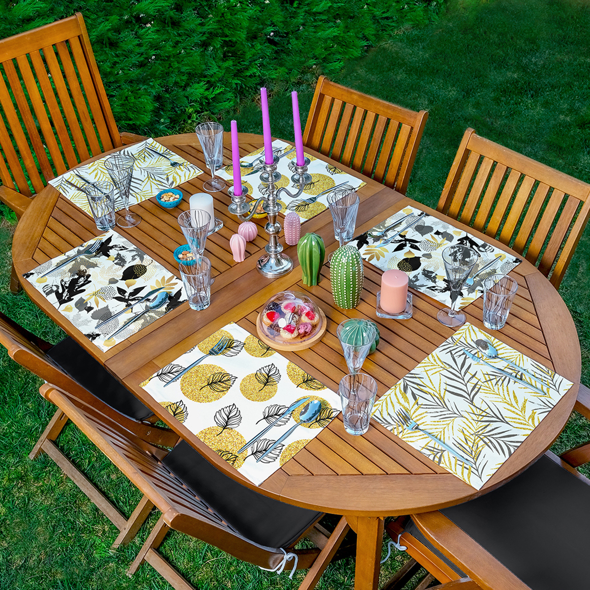 RealHomes Dijital Baskılı 6’lı Amerikan Servis seti, kumaş seçimi ve desen detaylarıyla şık bir dekorasyon ögesi olarak kullanımınıza sunulmaktadır. Her bir desen RealHomes tasarımcıları tarafından özenle tasarlanmış ve satışa sunulmuştur. Fotoğraf kalitesinde canlı ve gerçekçi baskılarımız yıkamaya ve kullanıma bağlı olarak solma yapmaz, yıllar boyu ilk günkü özelliğini korur.