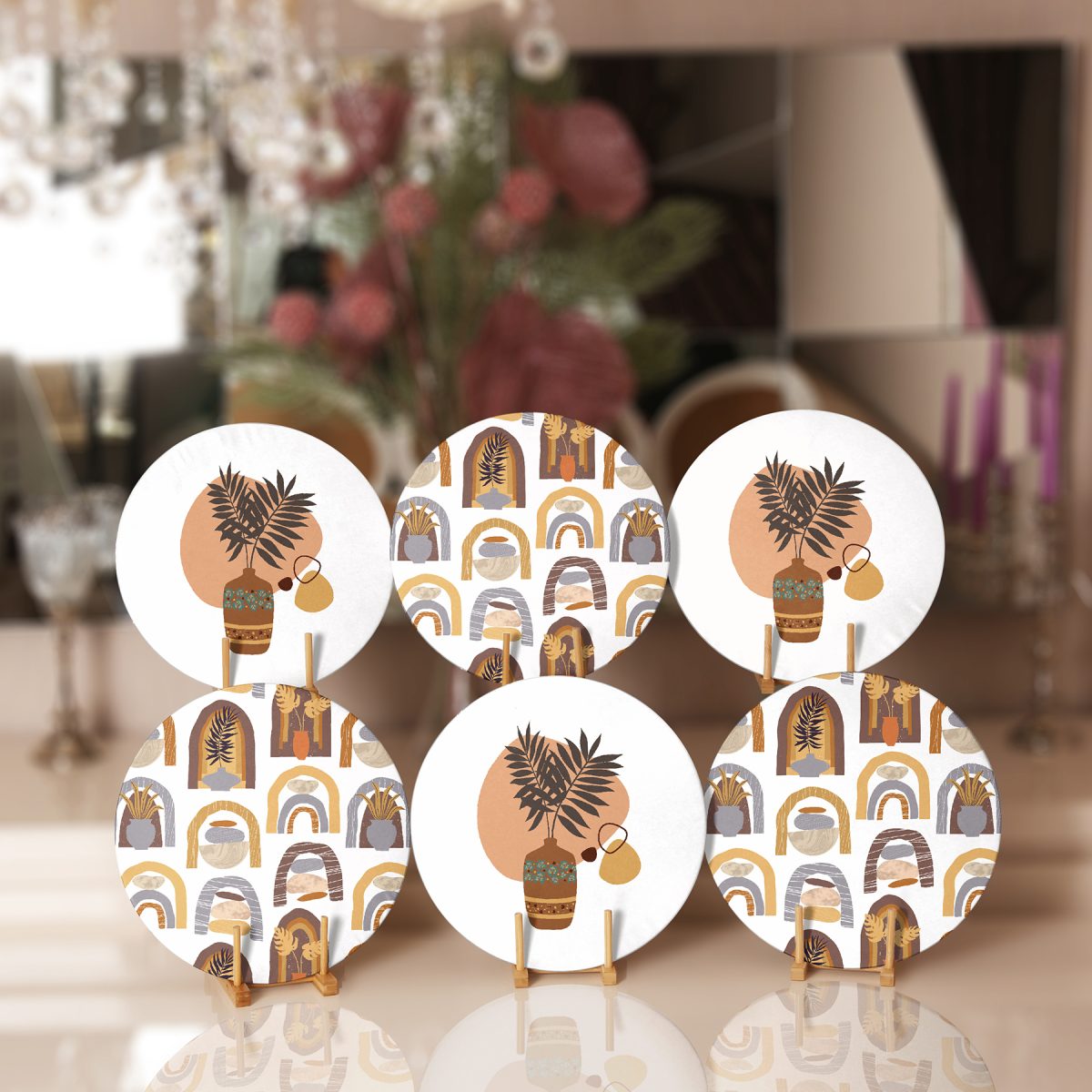 6’lı Etnik Motifli Onedraw Temalı Saksılı Tropik Yapraklar Yuvarlak Servis Altlığı & Supla