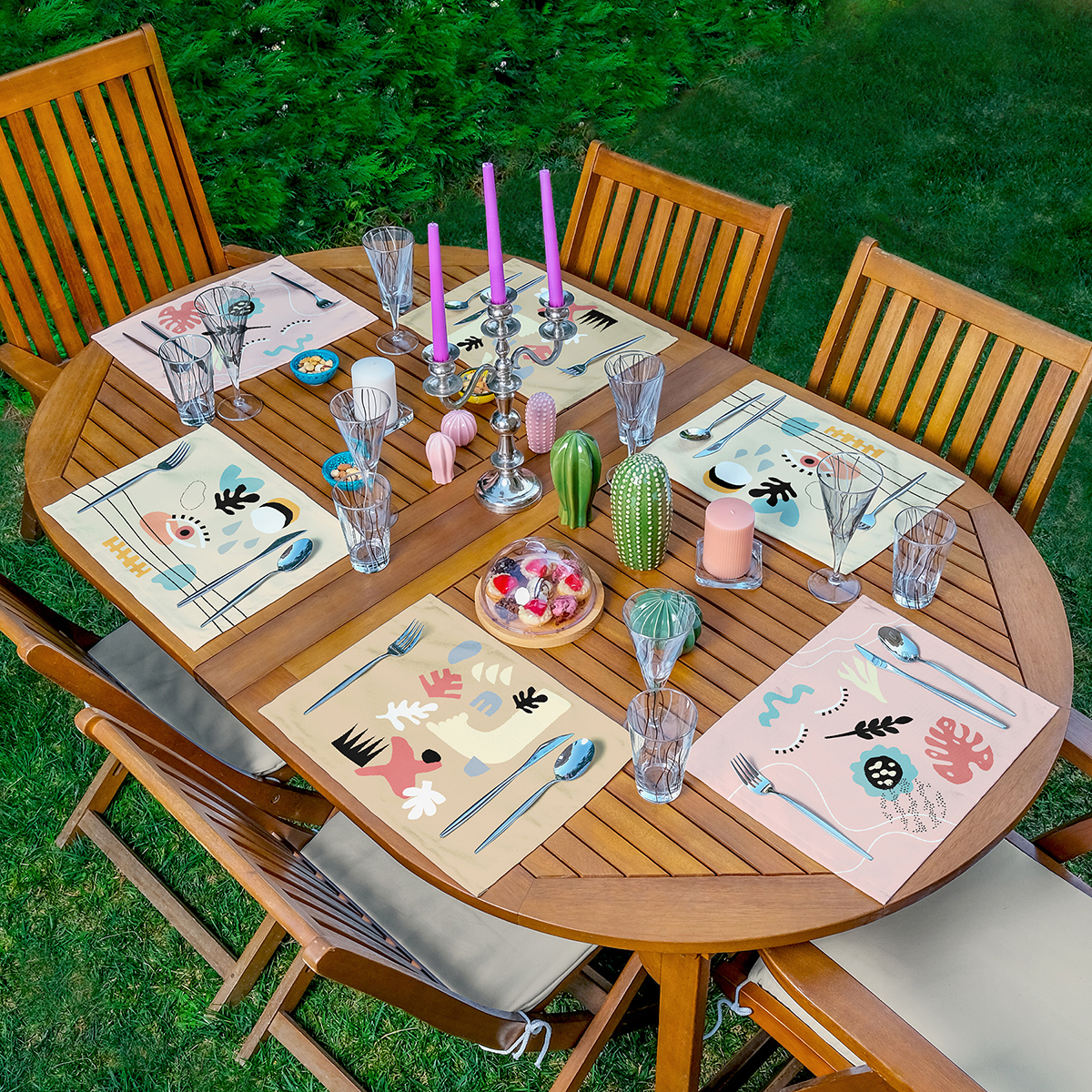 RealHomes Dijital Baskılı 6’lı Amerikan Servis seti, kumaş seçimi ve desen detaylarıyla şık bir dekorasyon ögesi olarak kullanımınıza sunulmaktadır. Her bir desen RealHomes tasarımcıları tarafından özenle tasarlanmış ve satışa sunulmuştur. Fotoğraf kalitesinde canlı ve gerçekçi baskılarımız yıkamaya ve kullanıma bağlı olarak solma yapmaz, yıllar boyu ilk günkü özelliğini korur.