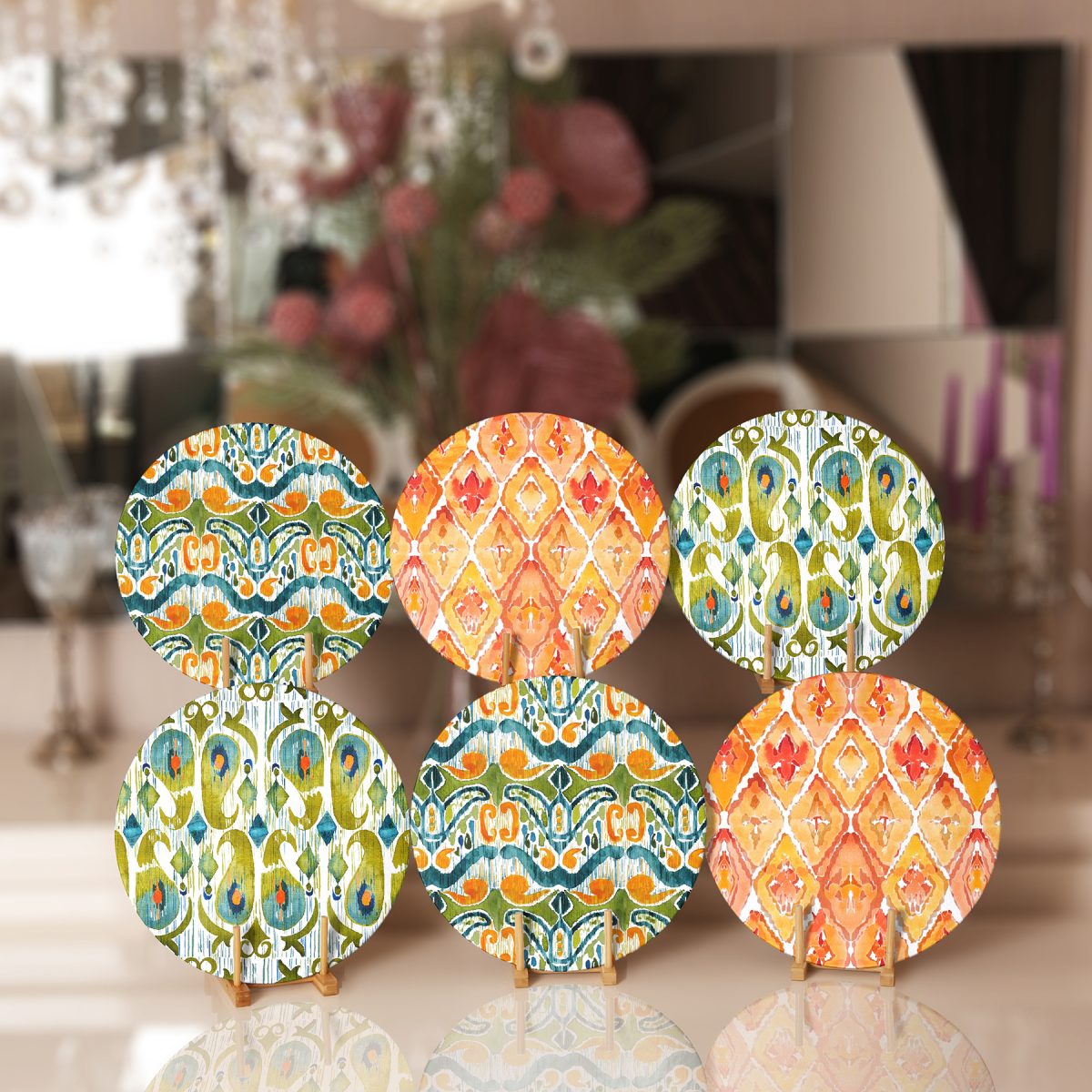 6’lı Turuncu Yeşil Renkli Suluboya Tasarımlı Dekoratif Yuvarlak Servis Altlığı & Supla
