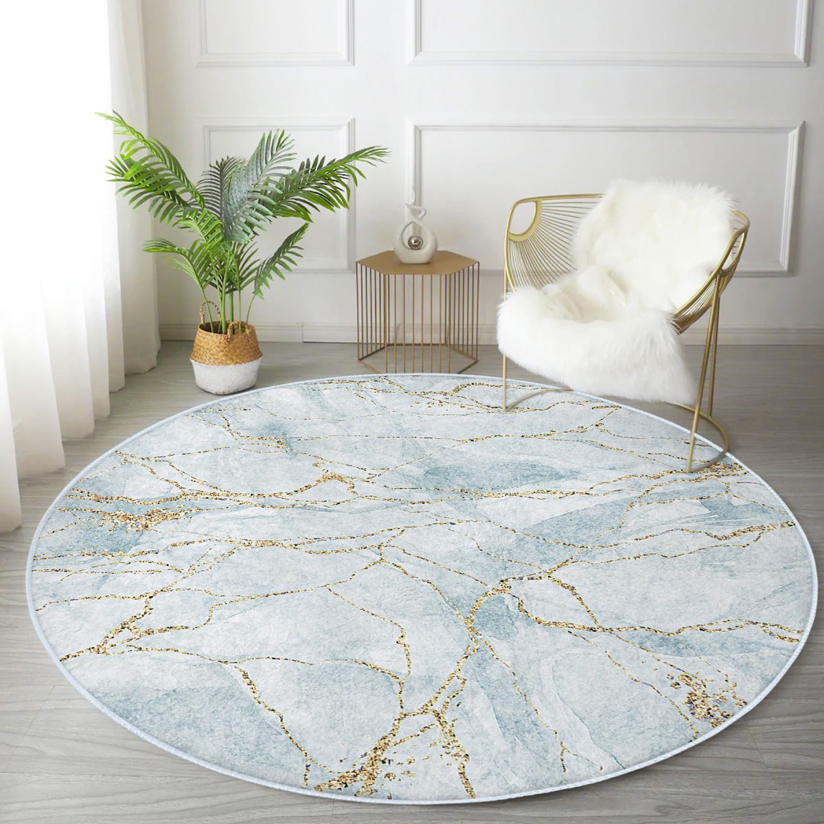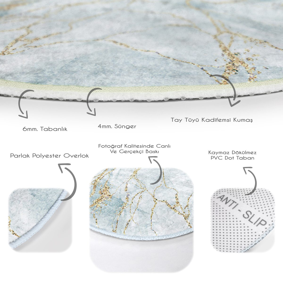 Altın Çizgili Mavi Zeminli Dijital Baskılı Lacivert Salon ve Oturma Odası Yıkanabilir Kaymaz Tabanlı Yuvarlak Halı