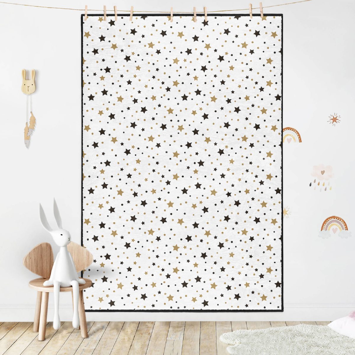 Altın Sarısı Siyah Yıldız Desenli Çocuk & Genç Odası Makinede Yıkanabilir Kaymaz Tabanlı Özel Ölçü Dikdörtgen Pamuk Tabanlı Çocuk Halısı