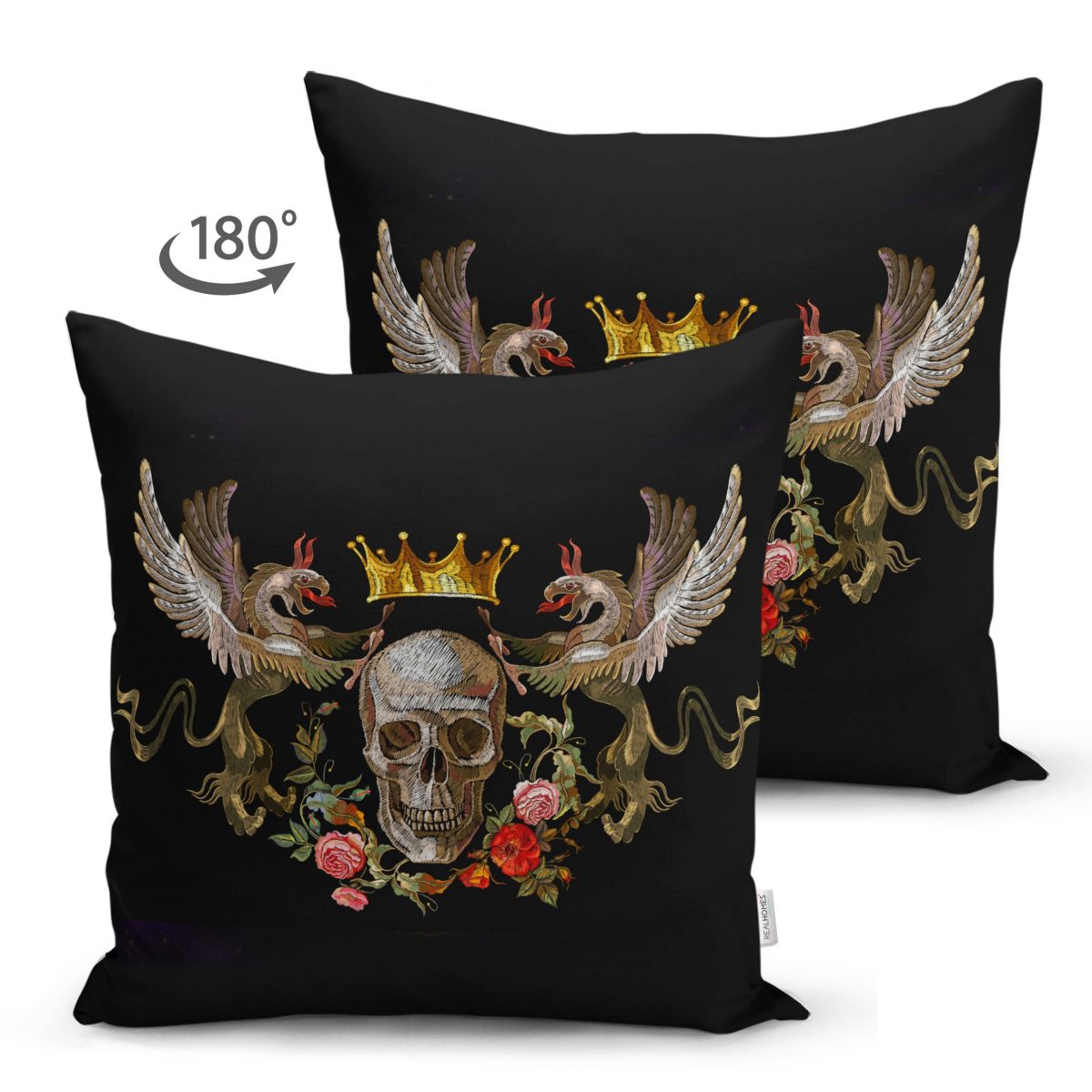 Altın Taç Motiftli Kuru Kafalı Özel Tasarım Çift Taraflı Dijital Baskılı Süet Kırlent Kılıfı