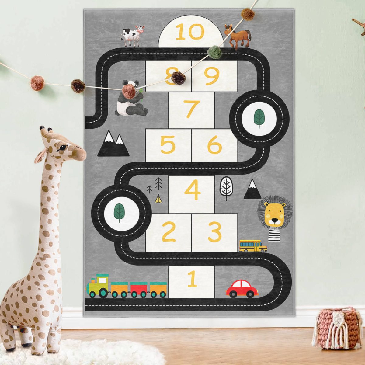 Renkli Hayvanlar Eğitici Yol Tasarımlı Çocuk & Genç Odası Makinede Yıkanabilir Kaymaz Tabanlı Yuvarlak Çocuk Oyun Halısı