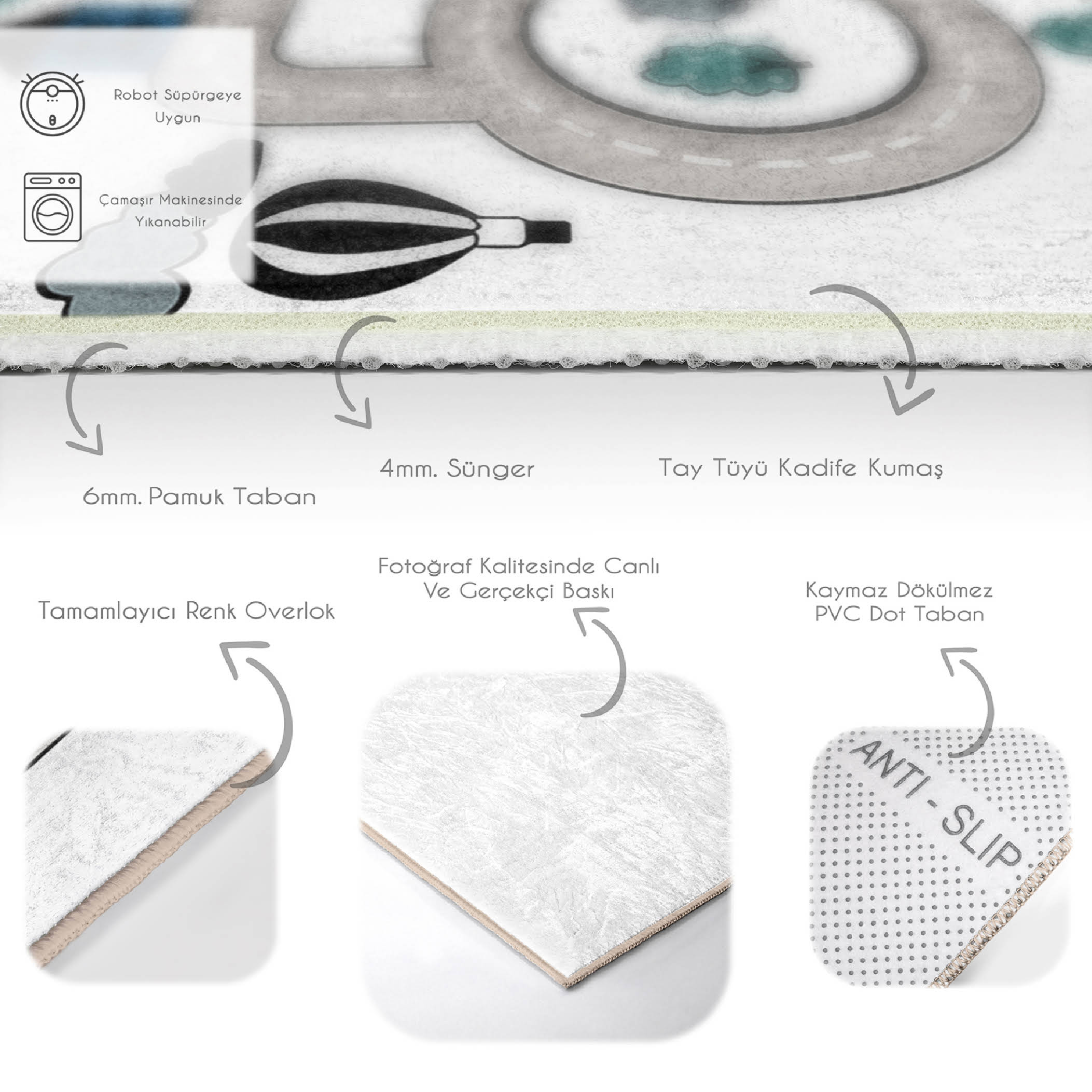 Araba Yollu Eğitici Tasarım Çocuk & Genç Odası Makinede Yıkanabilir Kaymaz Tabanlı Özel Ölçü Dikdörtgen Çocuk Oyun Halısı
