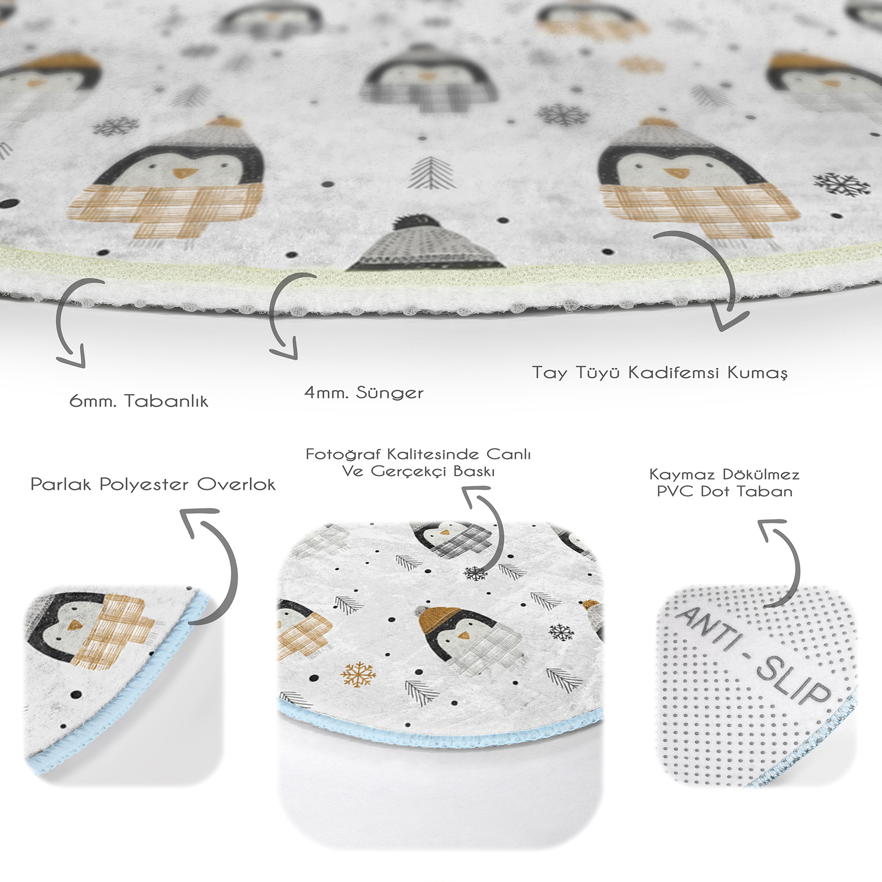 Atkılı Penguen Motifli Çocuk & Genç Odası Makinede Yıkanabilir Kaymaz Tabanlı Yuvarlak Çocuk Halısı