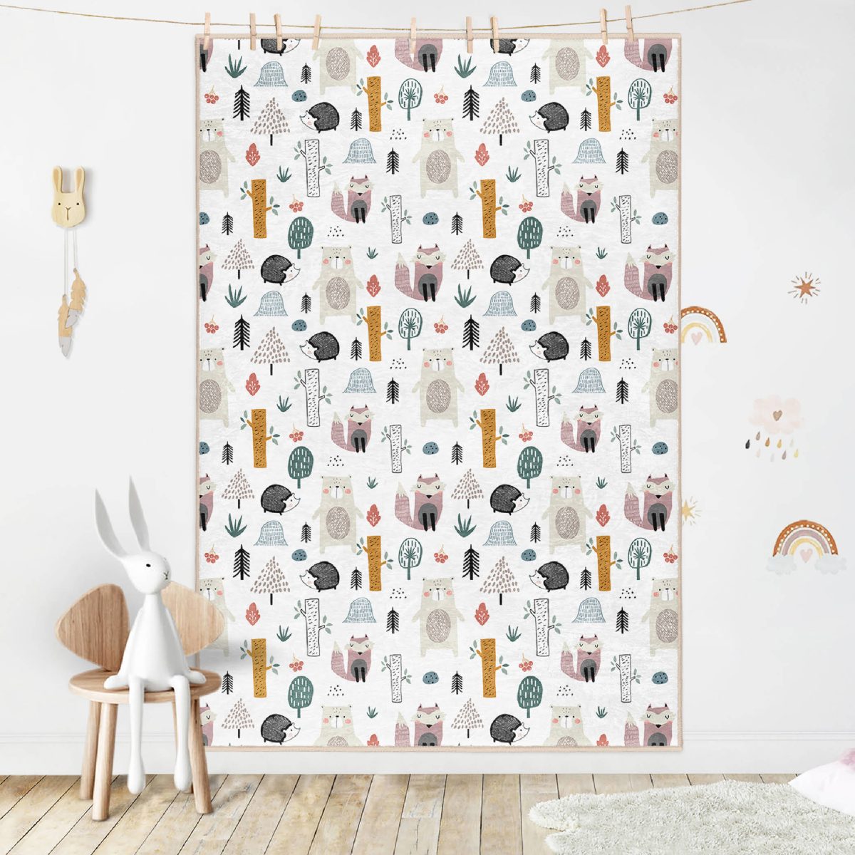 Ayıcık Ve Hayvanlar Motifli Çocuk & Genç Odası Dekoratif Makinede Yıkanabilir Kaymaz Tabanlı Dikdörtgen Özel Ölçü Çocuk Halısı