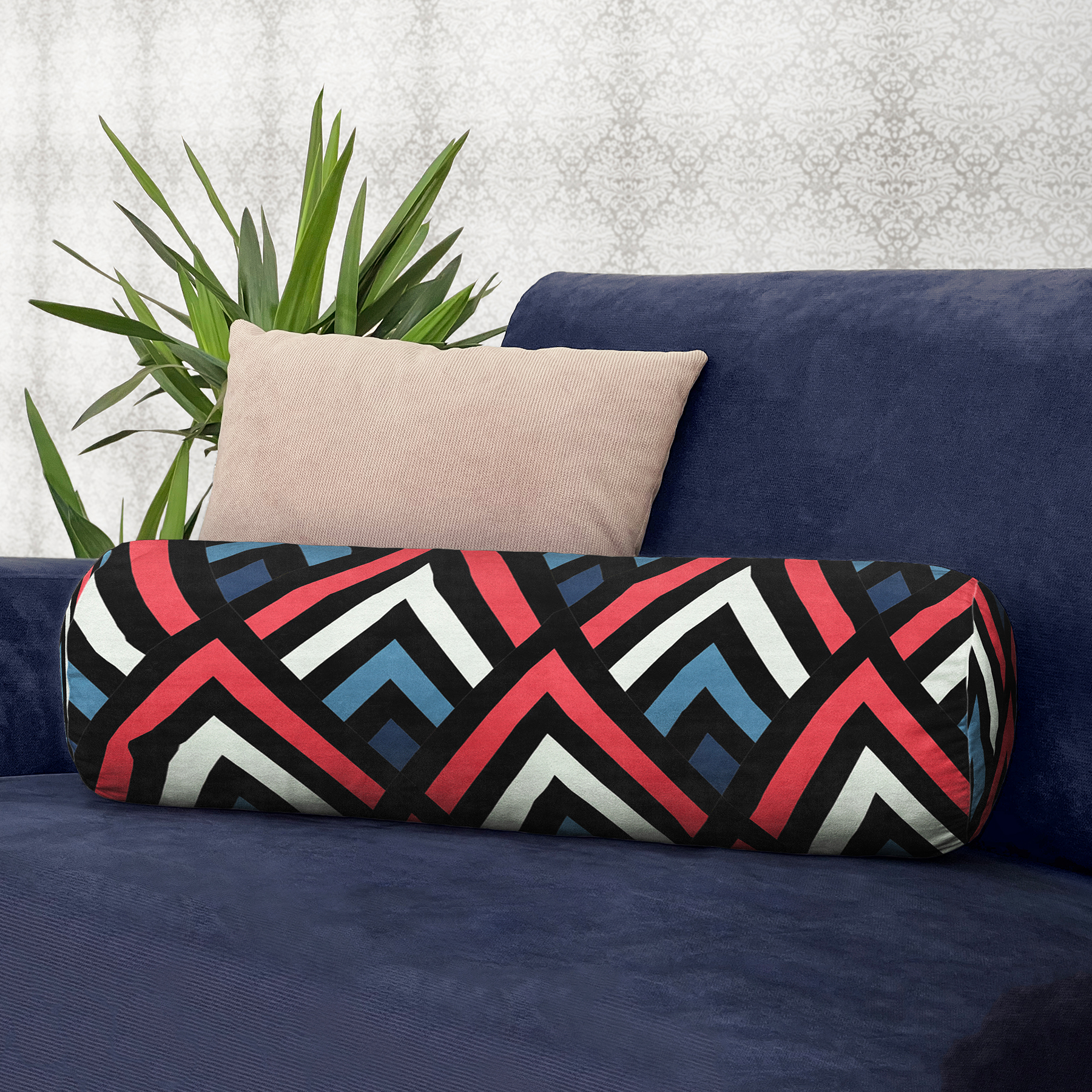 Baklava Desenli Renkli Modern İç Dolgulu – Fermuarlı Süet Silindir Yuvarlak Yastık Kırlent