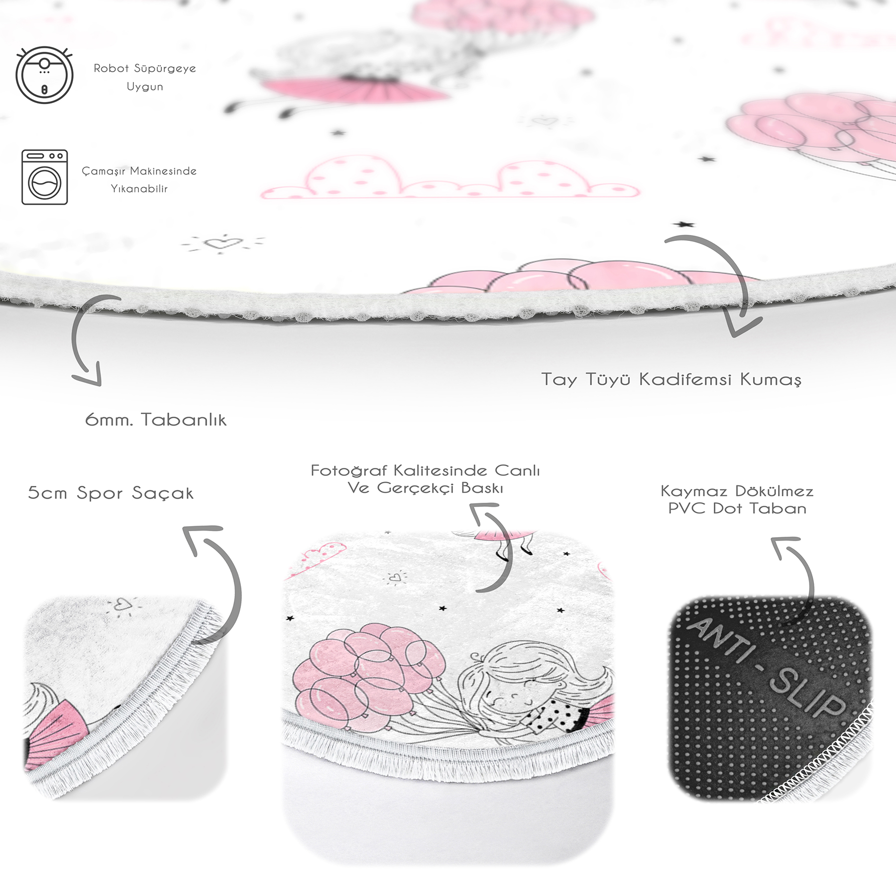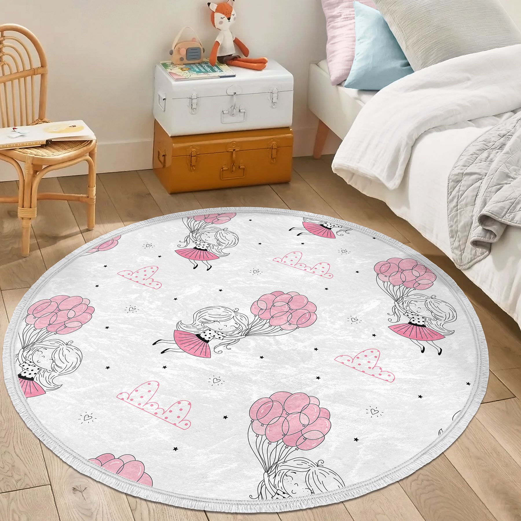 Balonlu Kız Motifli Çocuk & Genç Odası Makinede Yıkanabilir Kaymaz Tabanlı Püsküllü Yuvarlak Çocuk Halısı
